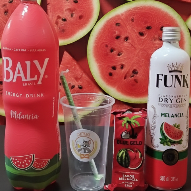 Acompanha 160 ml de gin sabor melancia ,1 energético baly Lata 250 ml sabor melancia 1 gelo de melancia copo 700 ml e canudo