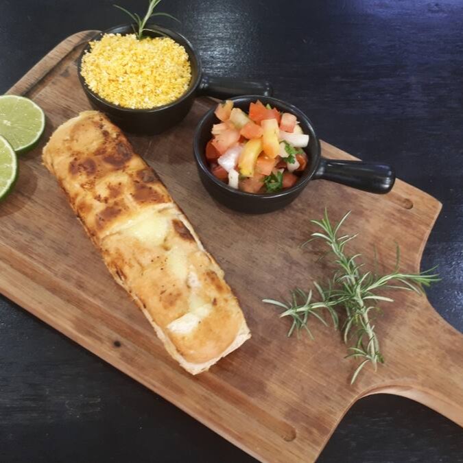 Nosso filé a cubana acompanha cortes de filé mignon empanados, 2 banana empanada, 2 pedaços macios de palmito de pupunha empanado, arroz branco e batatas fritas.