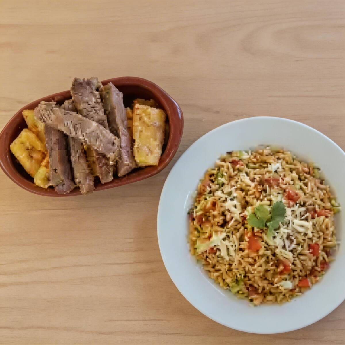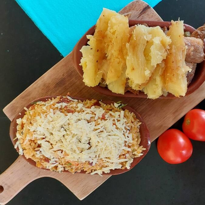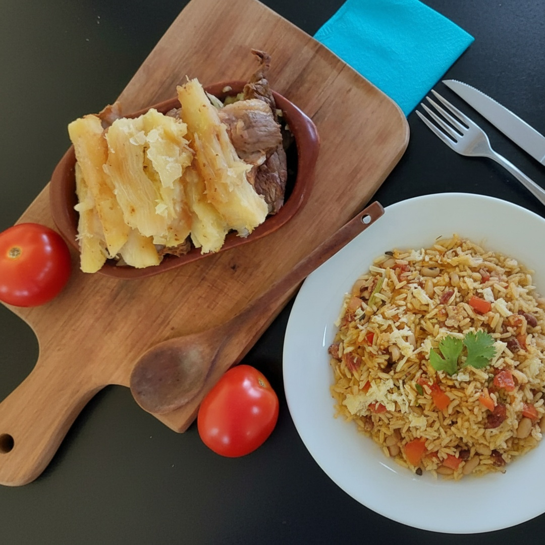 Baião de dois com carne de sol e mandioca cozida.