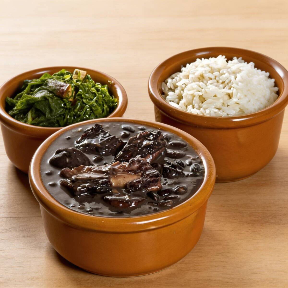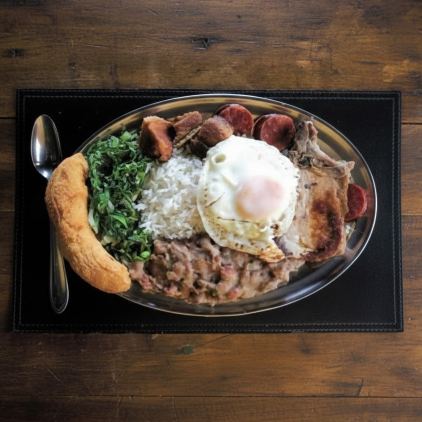 Acompanhamentos: arroz branco, feijão preto, couve na manteiga, torresmo, farofa, bisteca, carne seca e pertences de suíno (linguiça, paio, costelinha, pé, rabo e língua).
