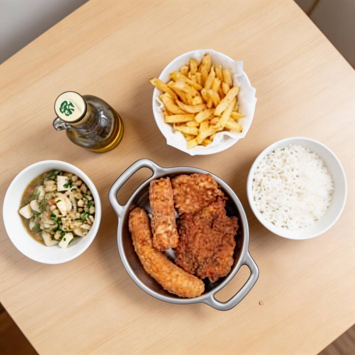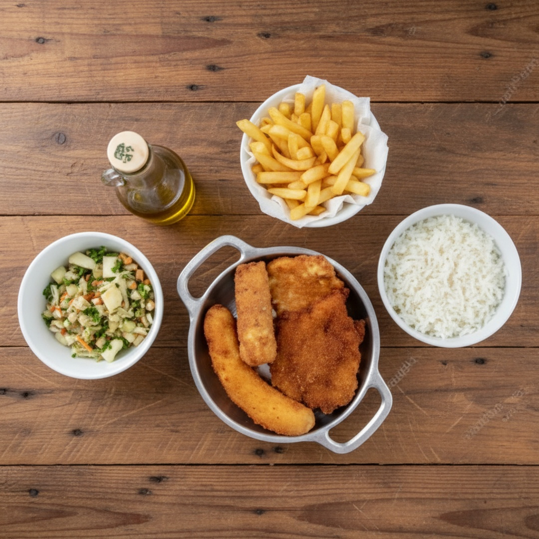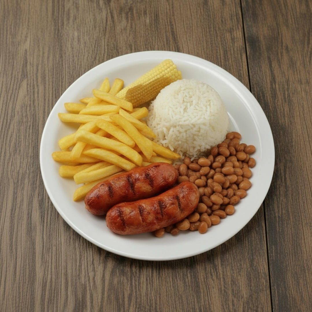 Acompanhamentos: arroz, feijão, batata frita e salada