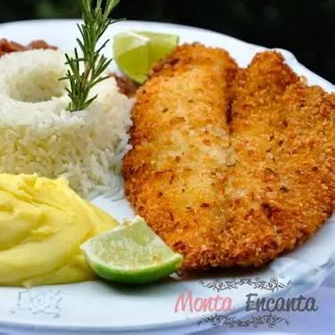 Acompanha arroz branco , fritas e filé mignon a parmegiana
