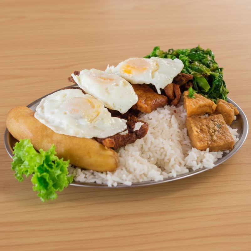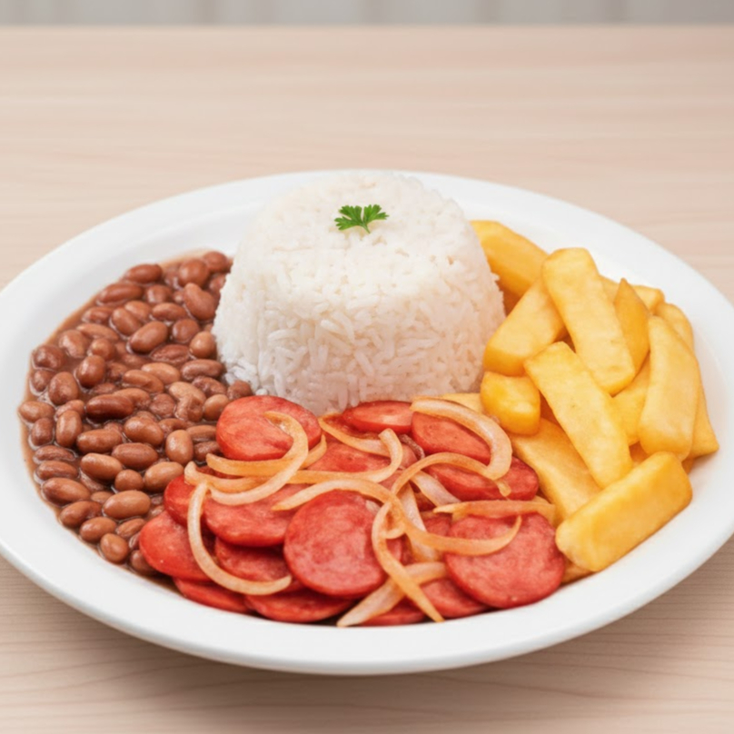 Acompanhamentos: arroz, feijão, ovo, batata frita e salada