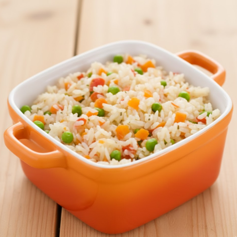 Delicioso arroz soltinho, com milho, ervilha e cenoura ralada.
