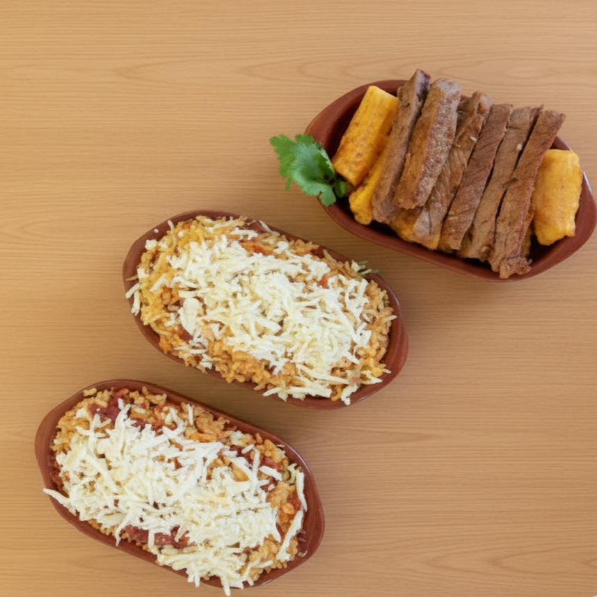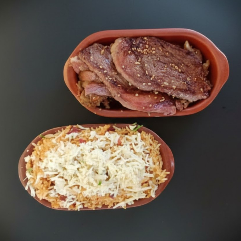 O Melhor Baião de Dois das regiões Norte e Nordeste servido com Carne de Sol Grelhada e Mandioca Frita e acompanhado por um feijão fradinho, arroz preparado na manteiga de garrafa, carne seca desfiada, bacon em cubos e queijo parmesão ralado.
