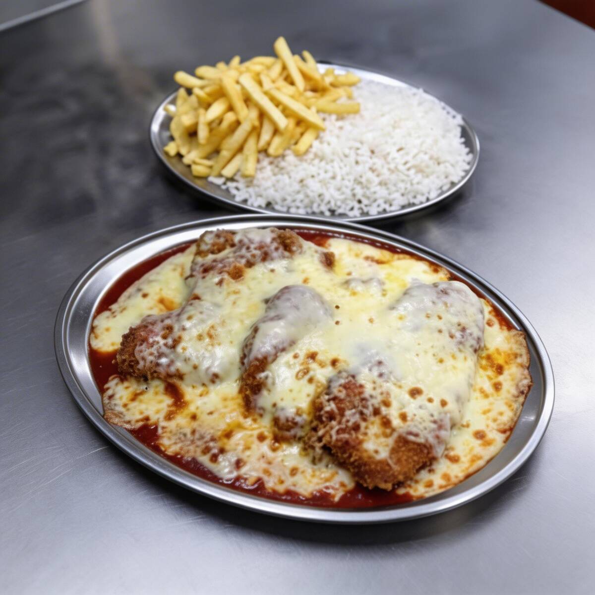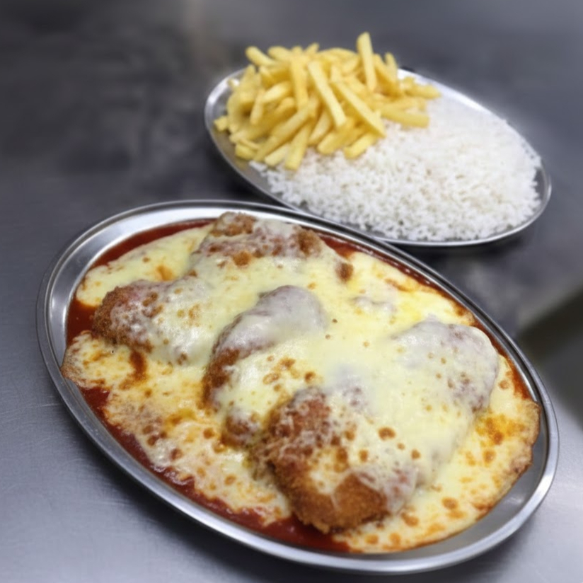 Acompanha arroz branco , batata frita e frango á parmegiana