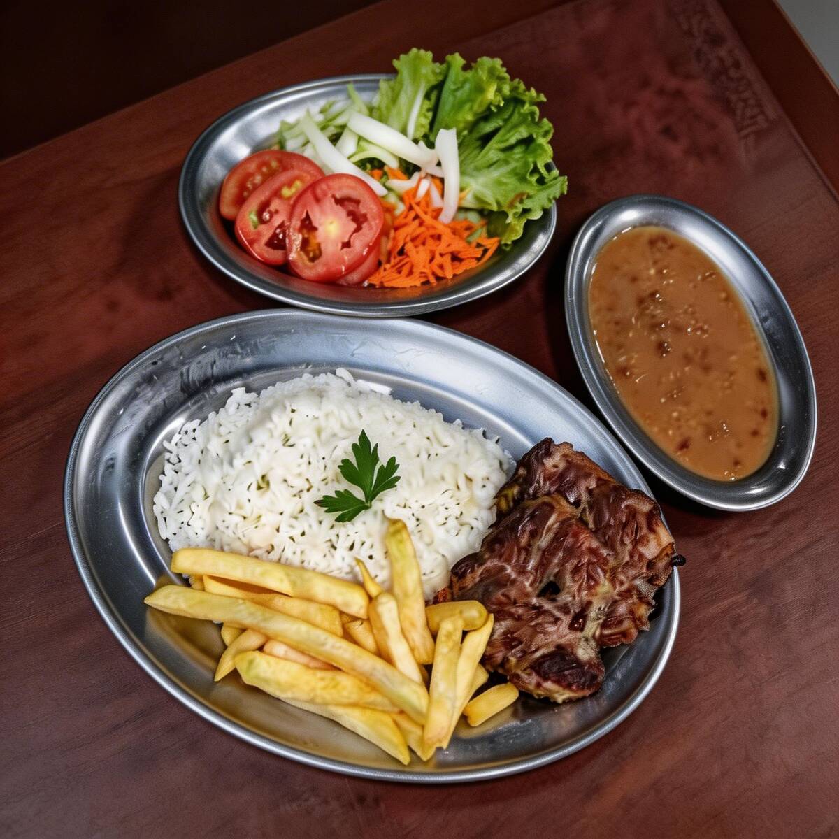 Acompanha arroz, fritas e o delicioso filé mignon ao molho mostarda.