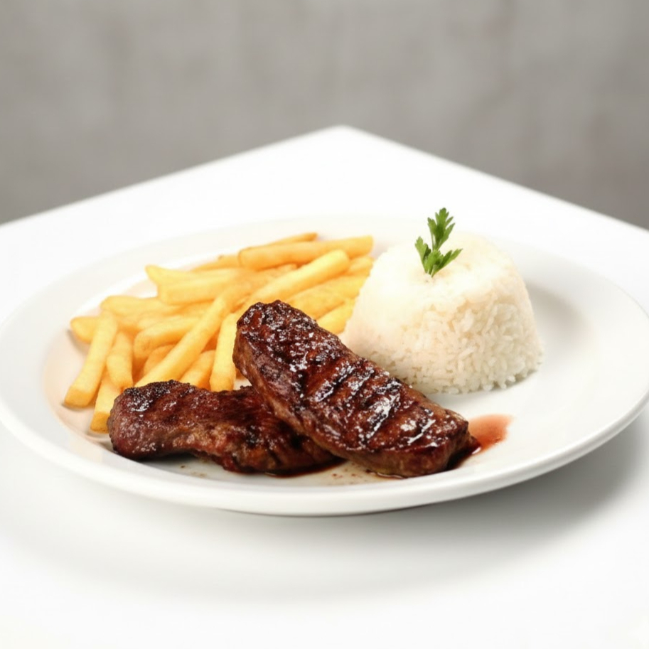 Arroz, Fritas, e Filé Mignon grelhado ao molho Madeira.