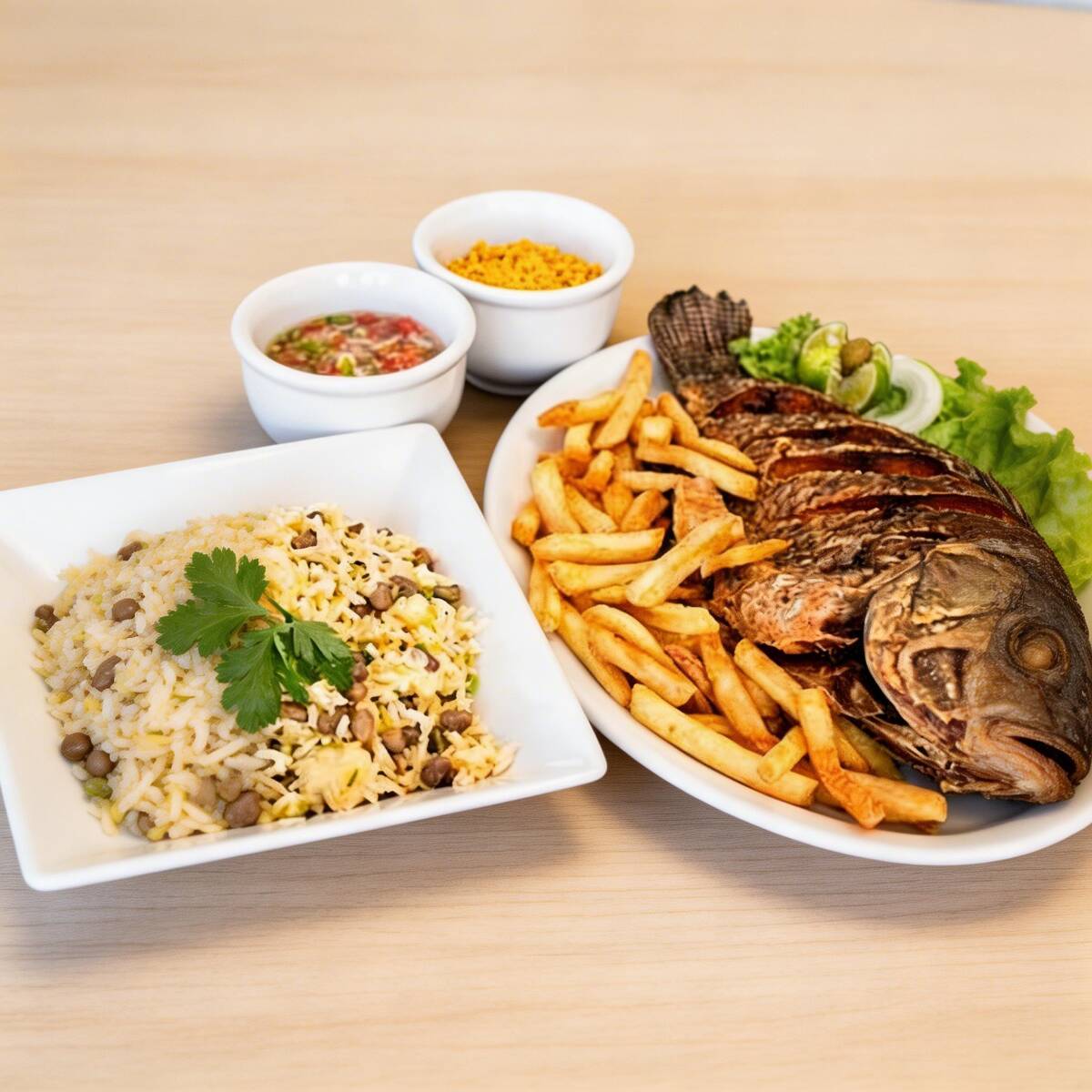 Feijão fraldinha, arroz ,carne seca desfiada , queijo coalho e tilápia inteira
