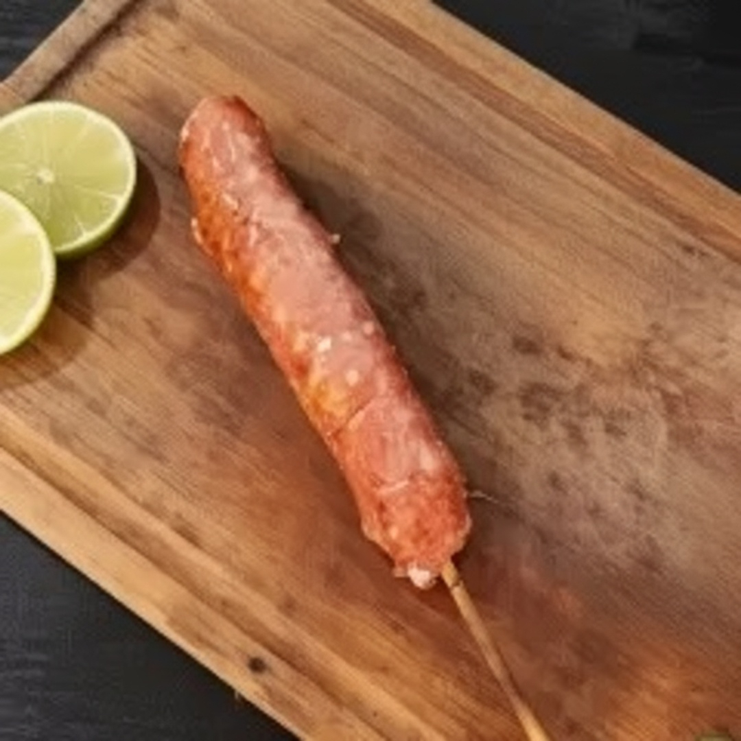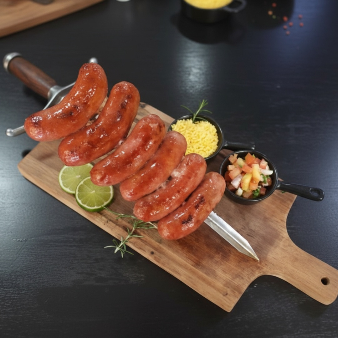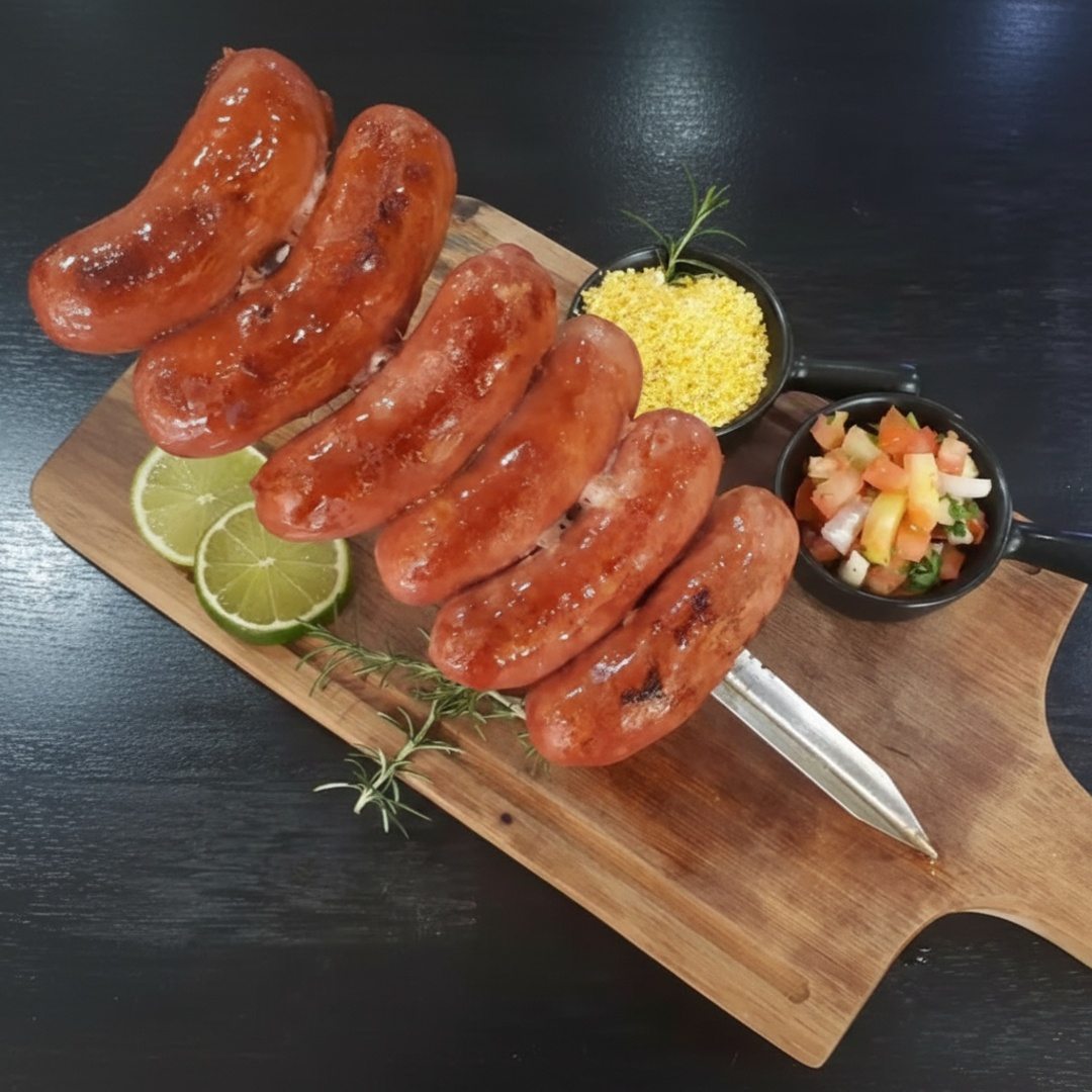 Linguiça toscana assada na brasa com peso estimado em 500 gramas.