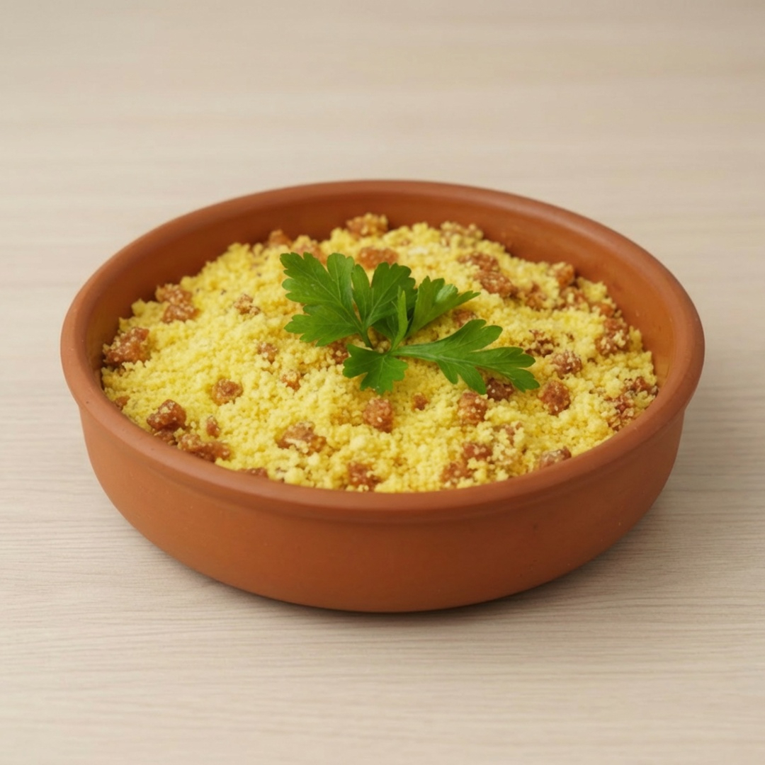 Farofa da Casa preparada a partir da farinha de mandioca.