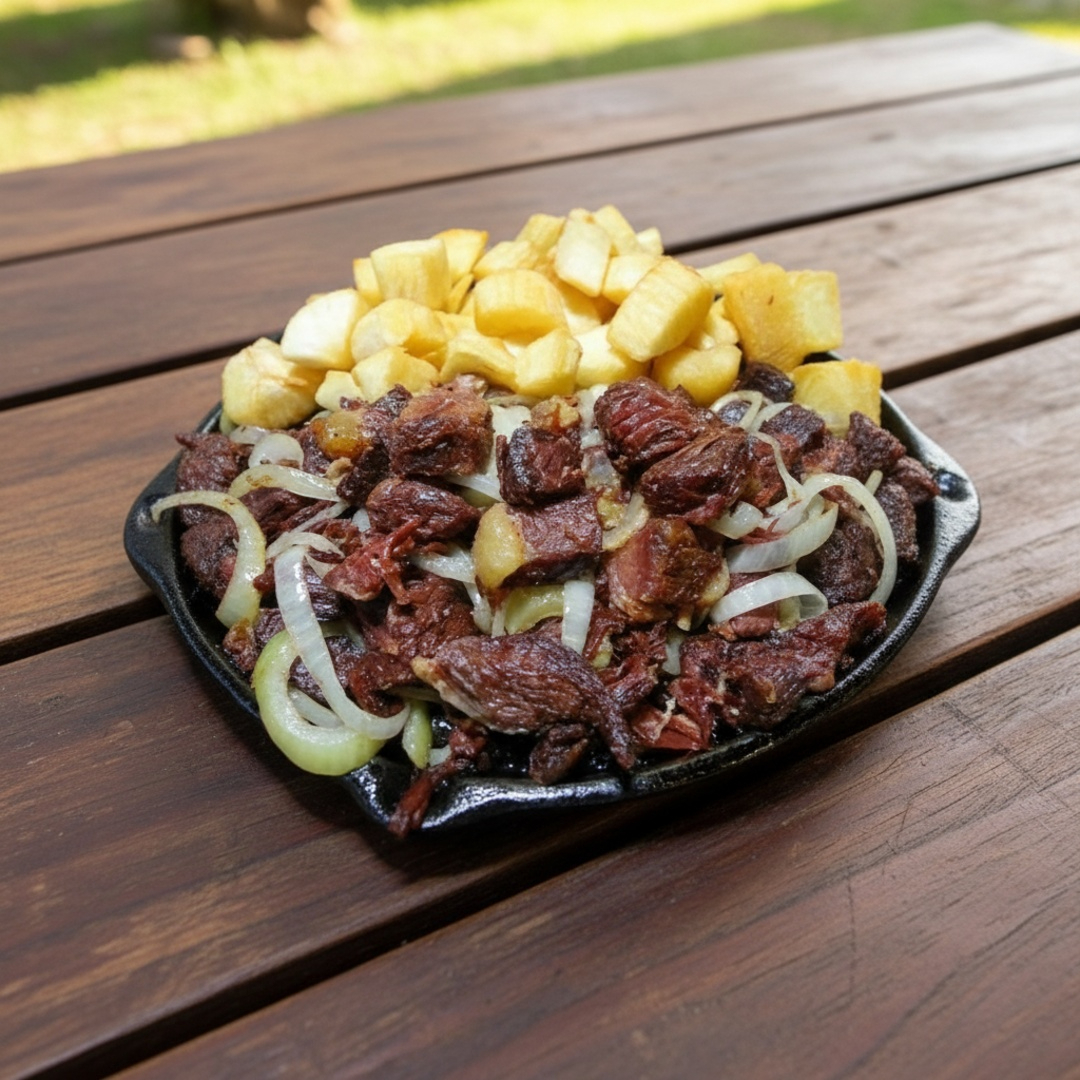 Feijão fraldinha, arroz ,carne seca desfiada , queijo coalho e Picanha grelhada na Brasa