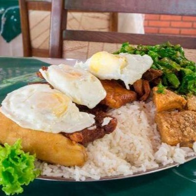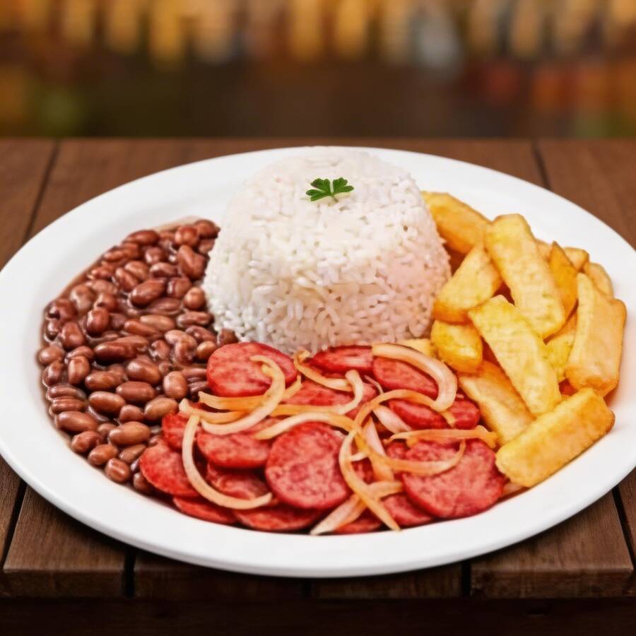 Acompanhamentos: arroz branco , feijao tropeiro , bisteca , calabresa , torresmo , couve , ovo e banana milanesa