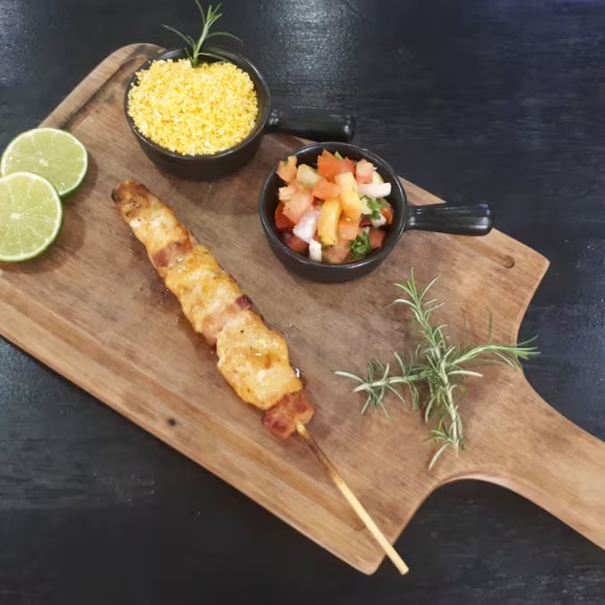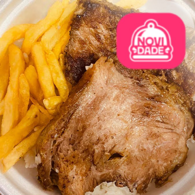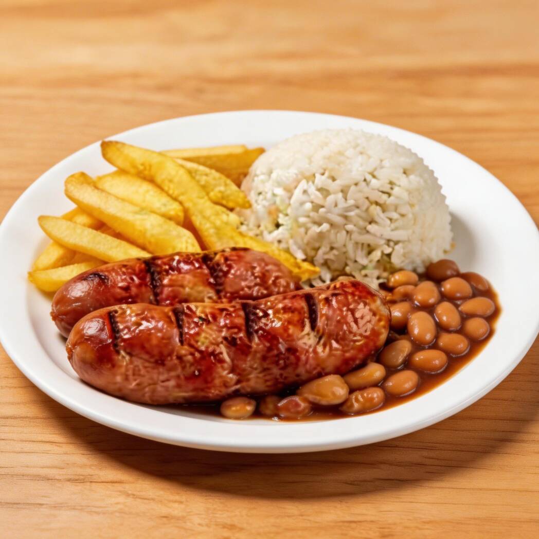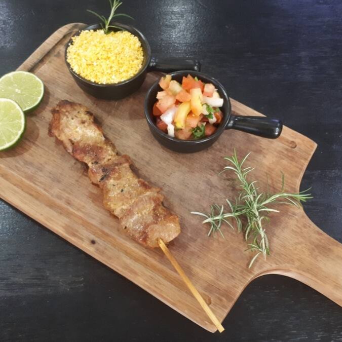 Acompanha: arroz, feijão e fritas. Churrasco: carne assada, linguiça e frango.