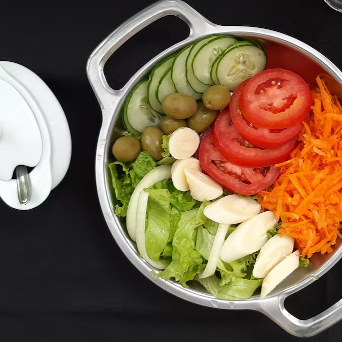 Para quem deseja uma alimentação mais leve e saudável, nossa salada é preparada com produtos frescos e selecionados como, alface, tomate, cebola, pepino japonês, cenoura ralada, palmito, e azeitonas.