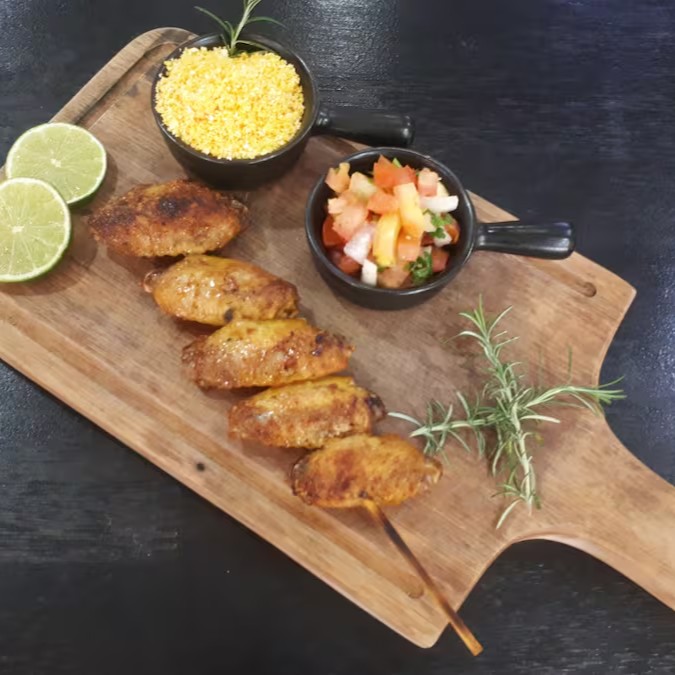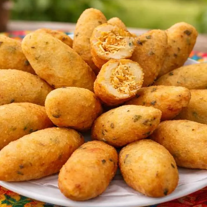 Delicioso bolinho artesanal feito com frango caipira, farinha de milho, polvilho e batata. Porção com 15 unidades e acompanha molho rose.