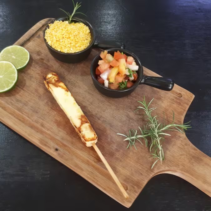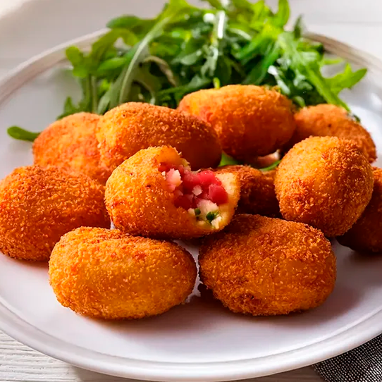 Delicioso bolinho artesanal feito com calabresa, farinha de milho, polvilho e batata. Porção com 15 unidades e acompanha molho rose.