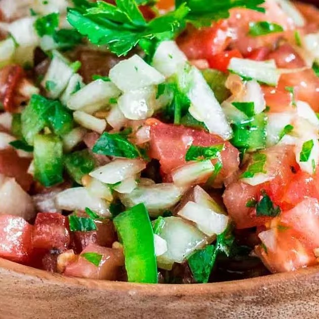 Vinagrete caseiro com tomates e cebolas picadinhos, salsinha, azeite, vinagre e sal.