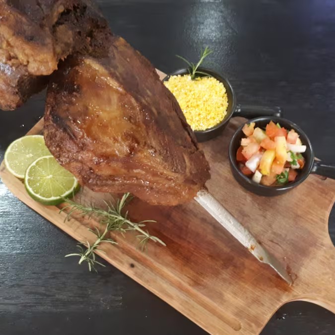 Coxa com sobrecoxa assadas na brasa com peso estimado em 500 gramas.