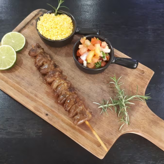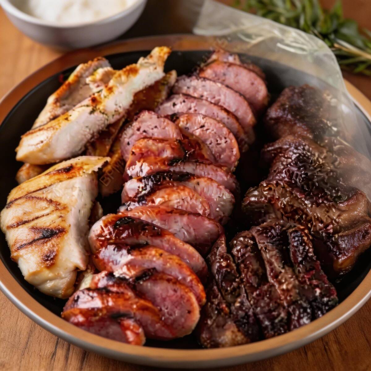 Nossa porção de churrasco misto, acompanha copa lombo, linguiça, costelinha, coxa sobre coxa e carne, com peso estimado em 500 gramas.