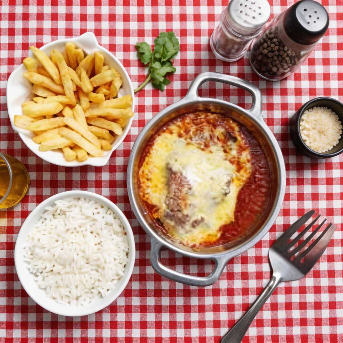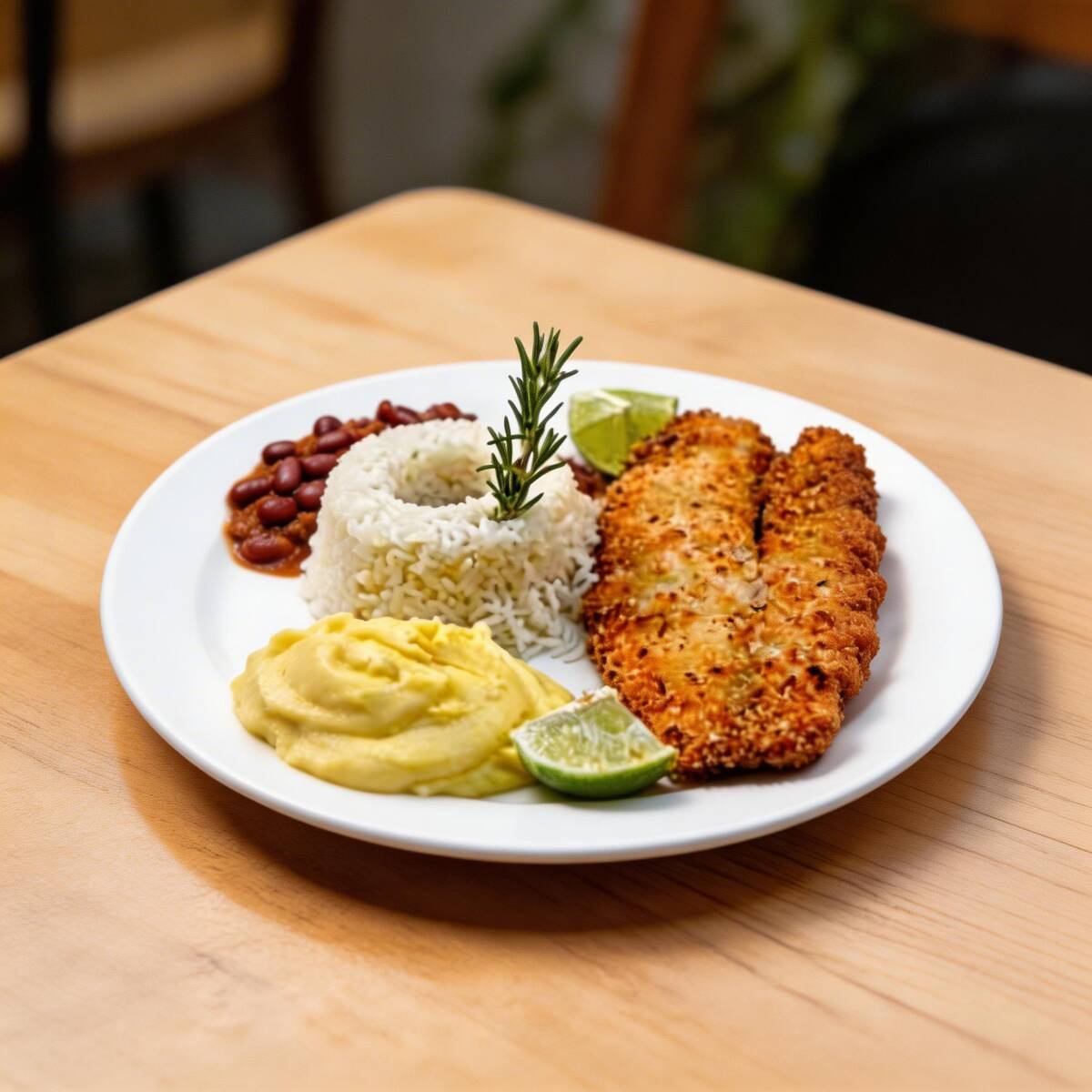 Acompanhamentos: arroz, feijão tropeiro, ovo e banana à milanesa.