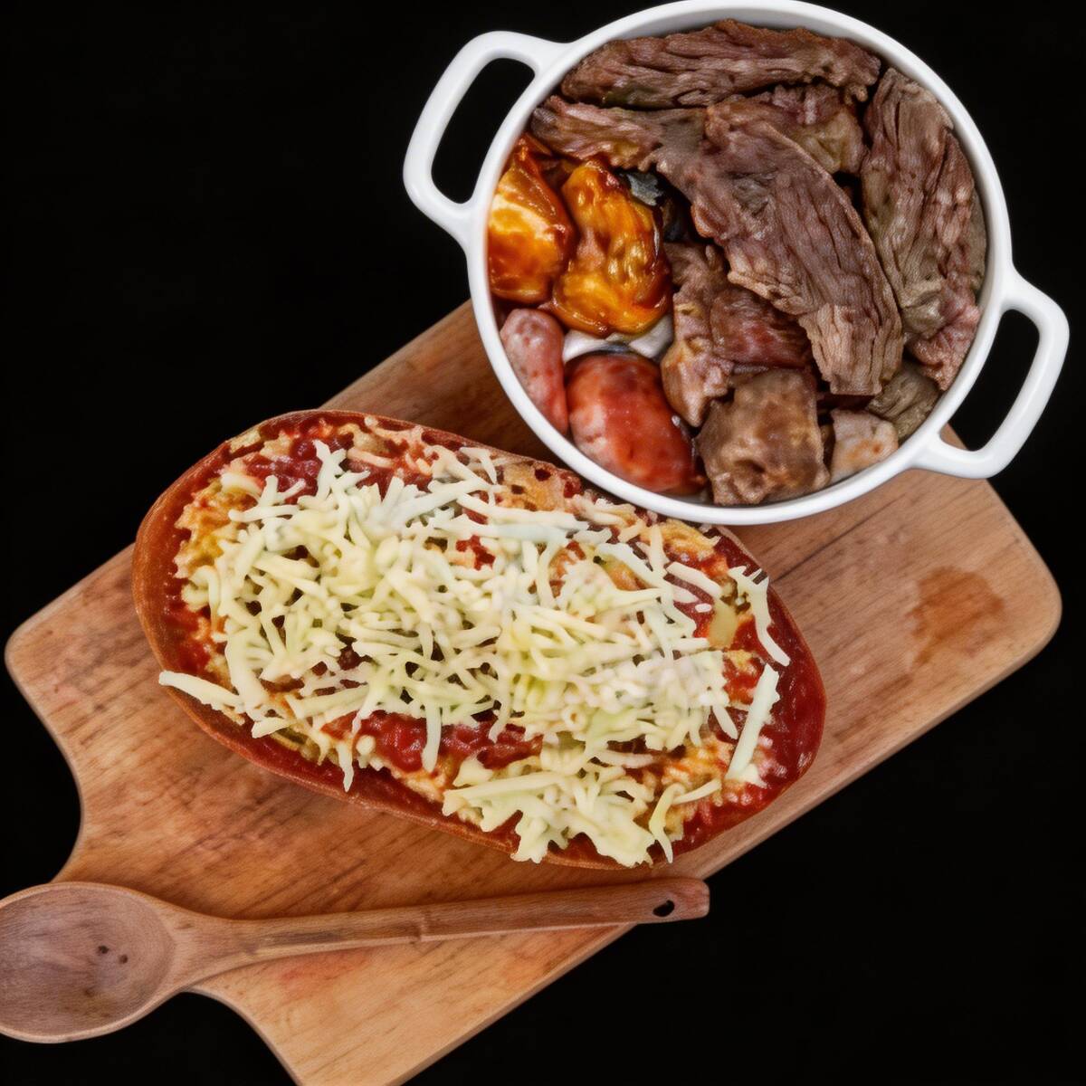 Feijão fraldinha , arroz, carne seca desfiada , queijo coalho e Costela ao Molho.