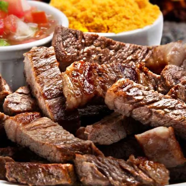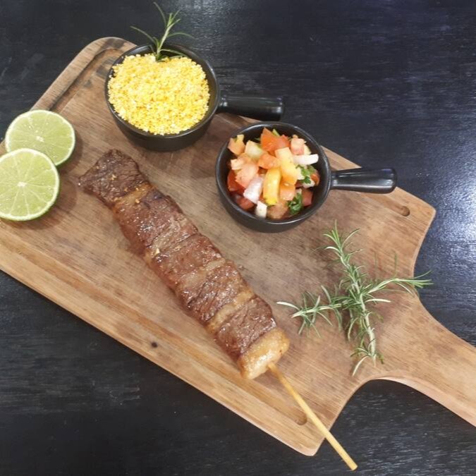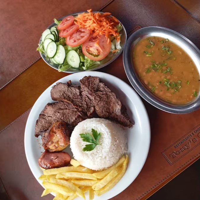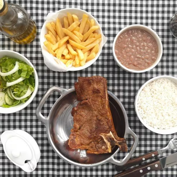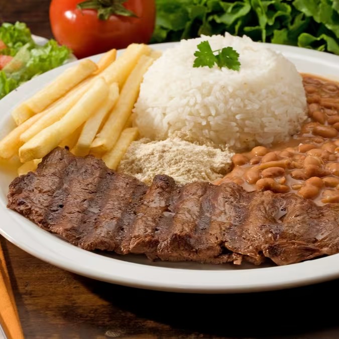 Acompanha: Arroz, fritas, uma picanha bem suculenta, farofa, vinagrete e salada.