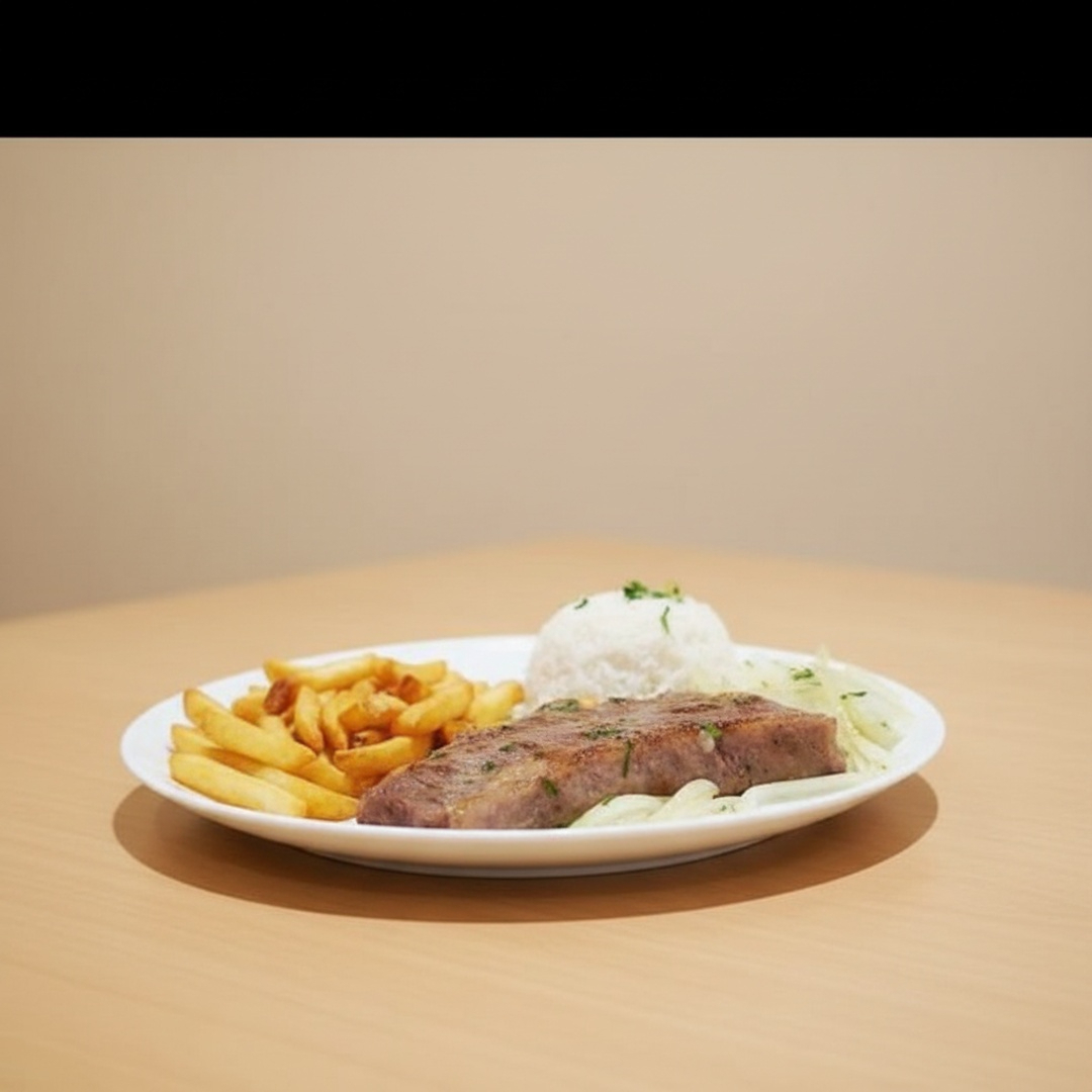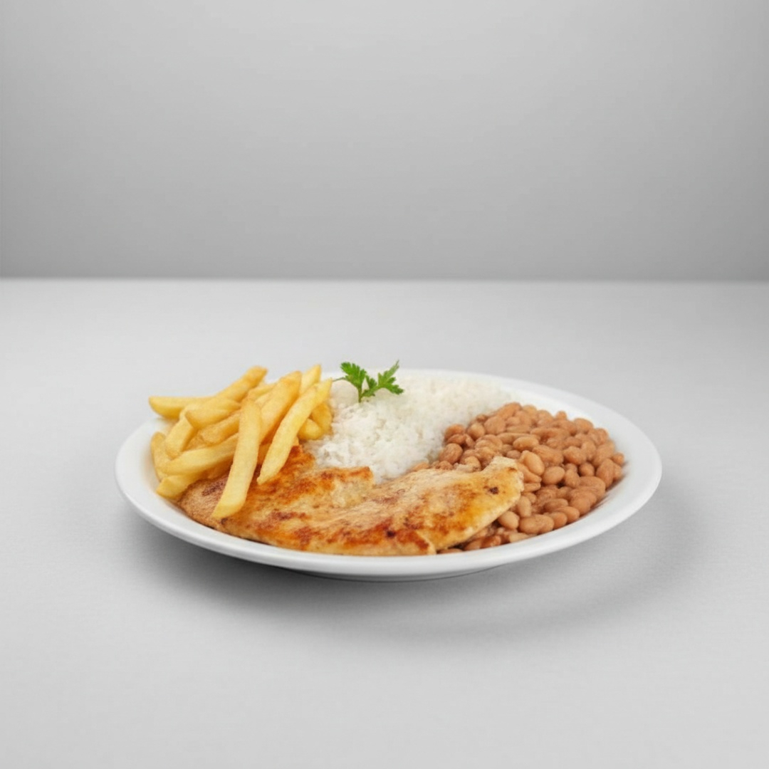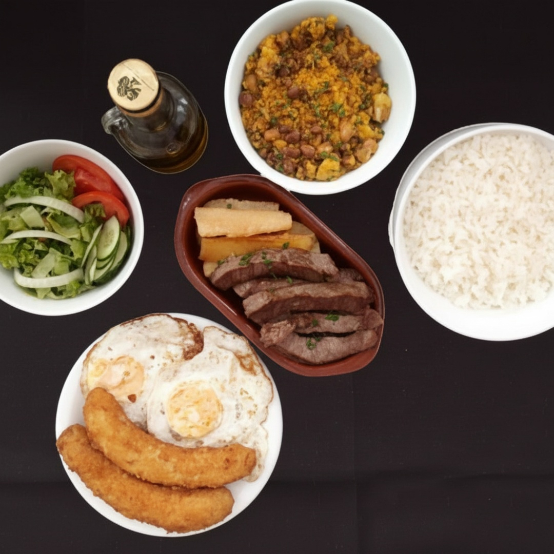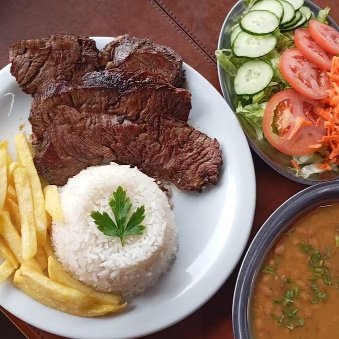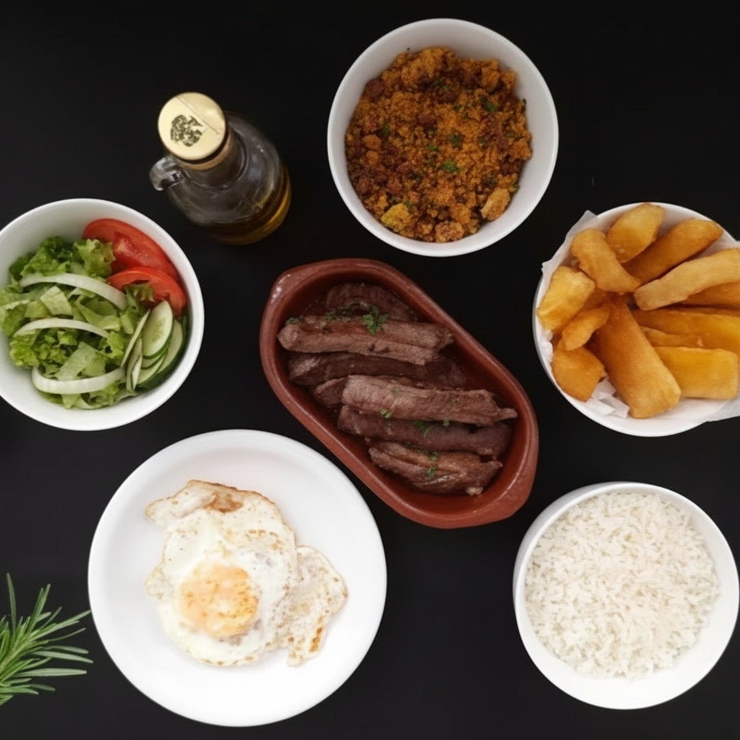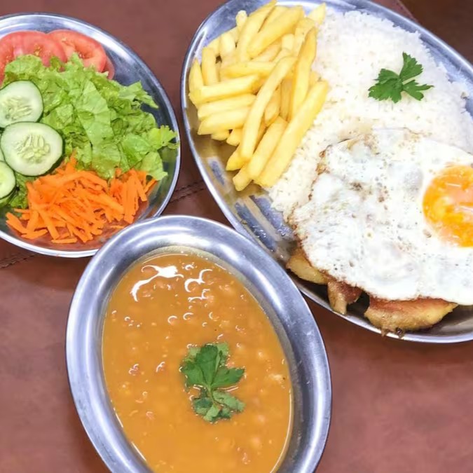 Acompanhamentos: arroz, feijão, ovo, batata frita e salada.