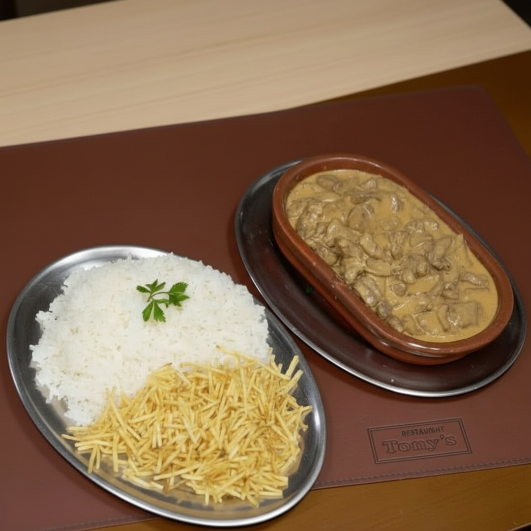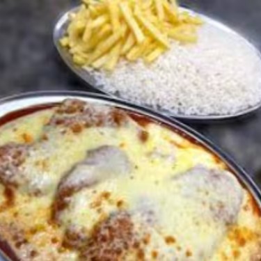 Acompanha arroz branco , fritas e filé mignon á parmegiana (serve duas pessoas)