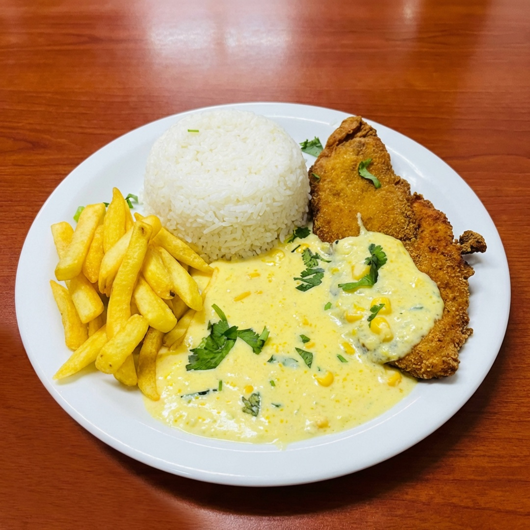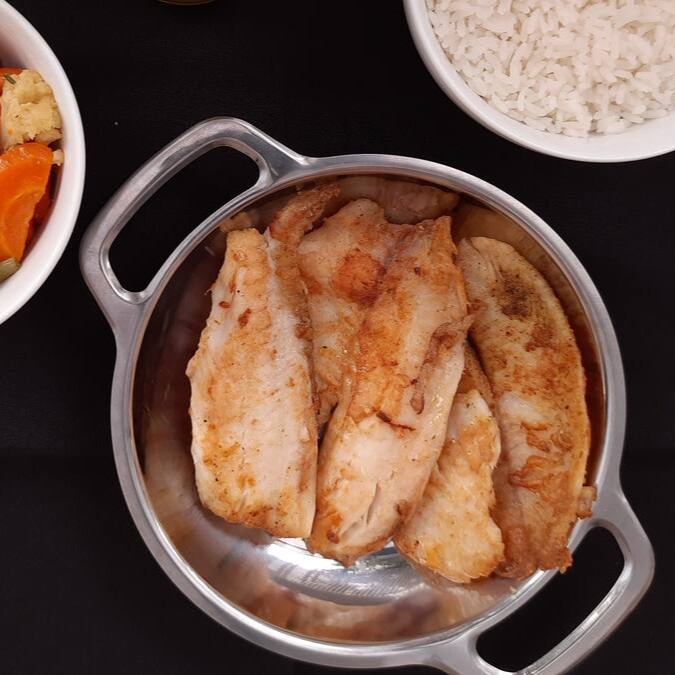 Acompanha arroz branco , fritas e frango á Parmegiana (serve duas pessoas)