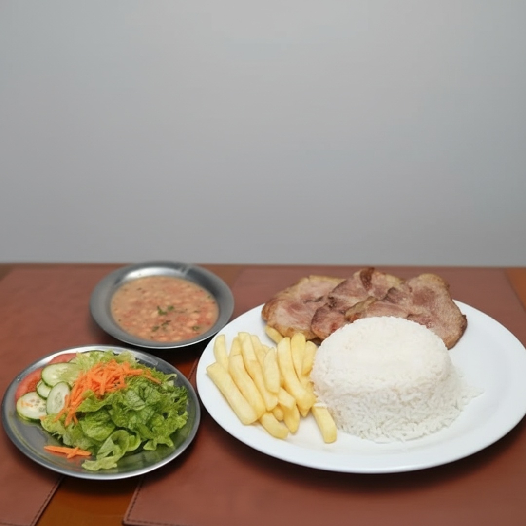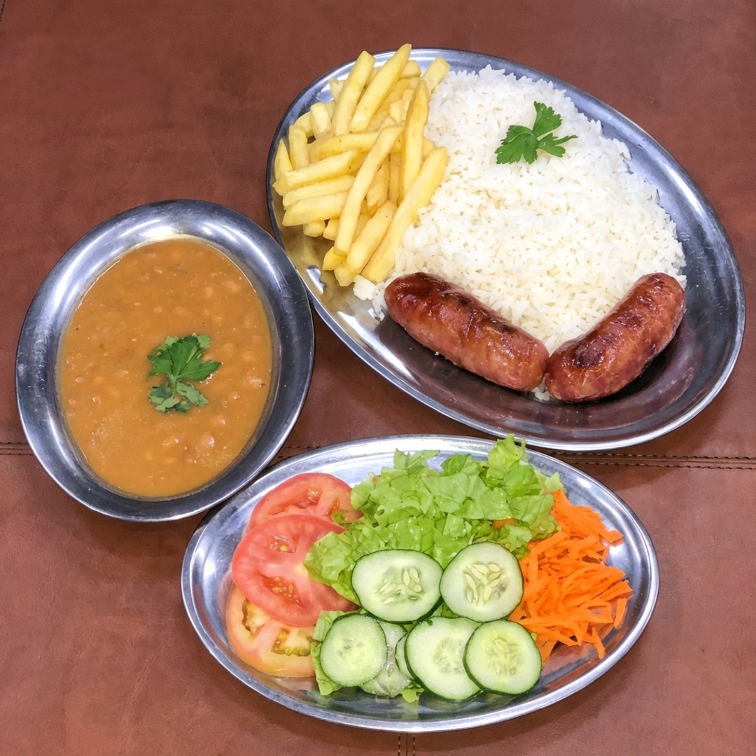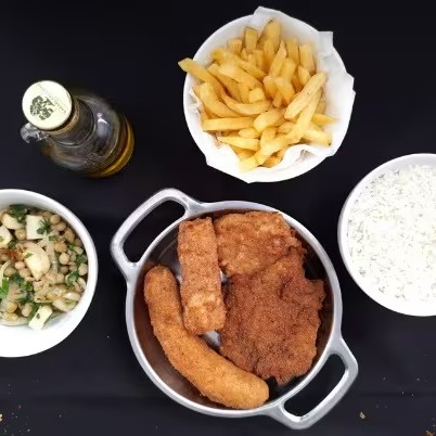 Acompanhamentos: arroz, feijão, batata frita e salada