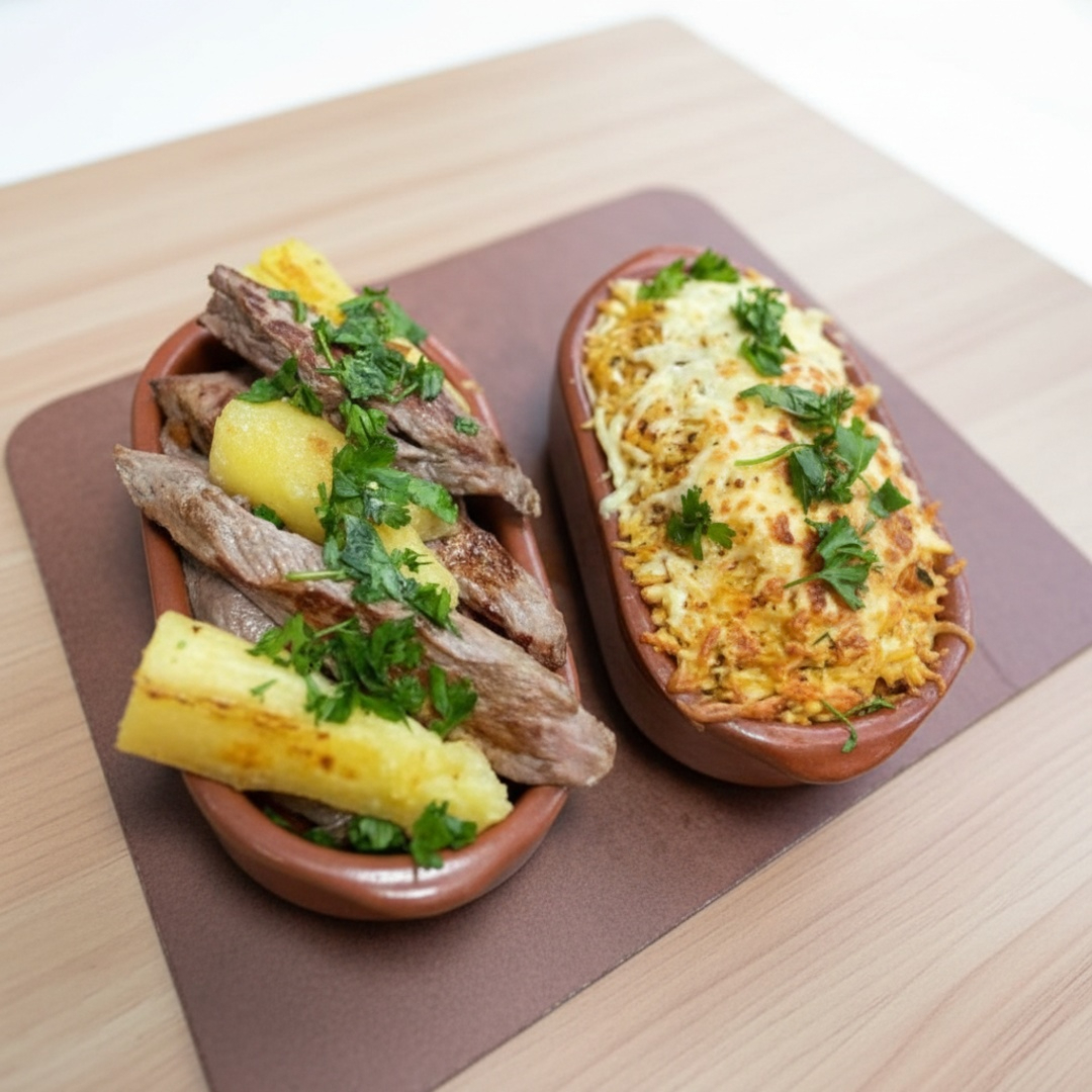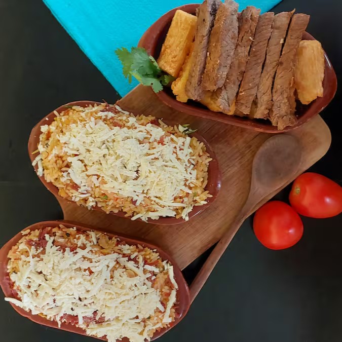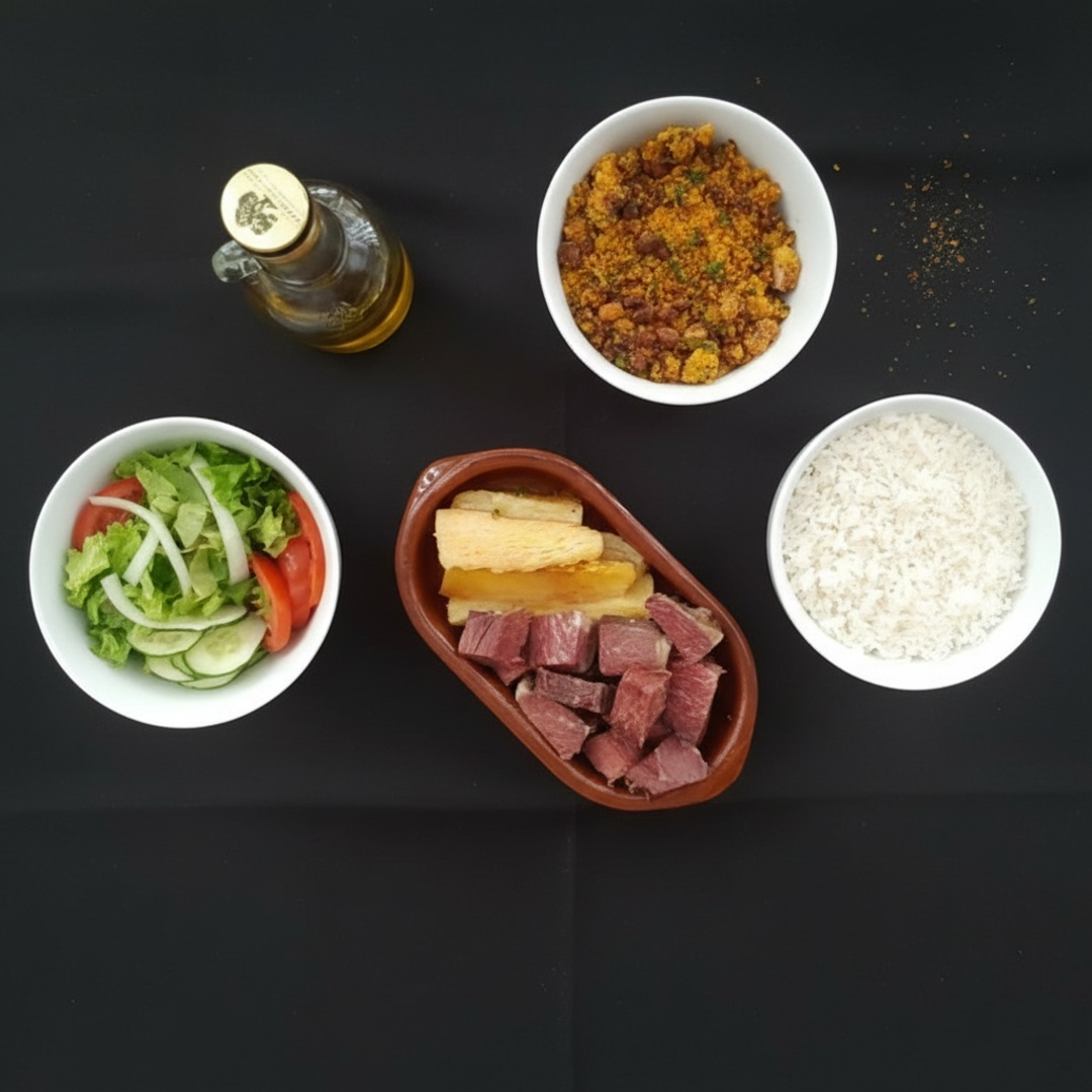 Este prato típico representando as regiões Norte e Nordeste é delicioso e em seus acompanhamentos temos, arroz, feijão carioca ou feijão tropeiro, carne seca com mandioca e uma saladinha.