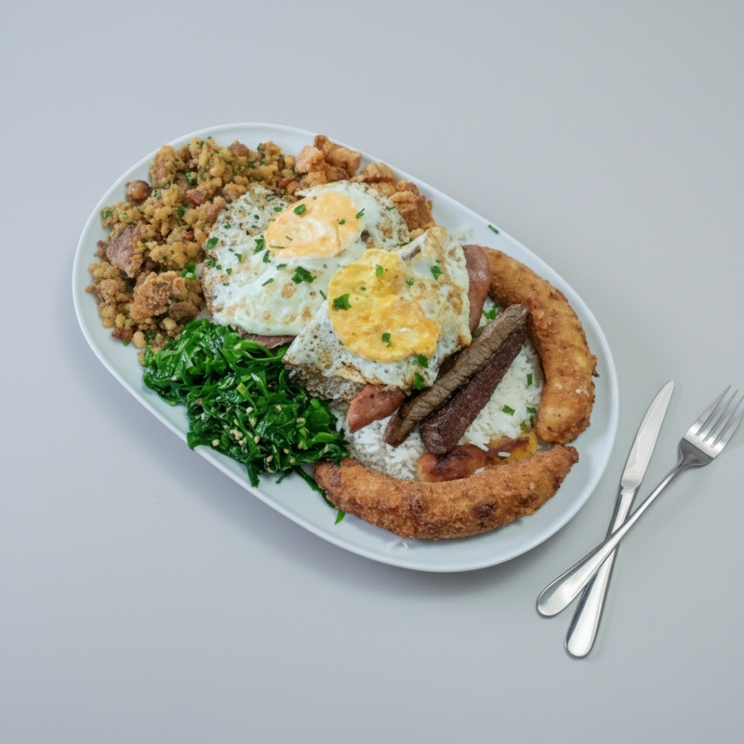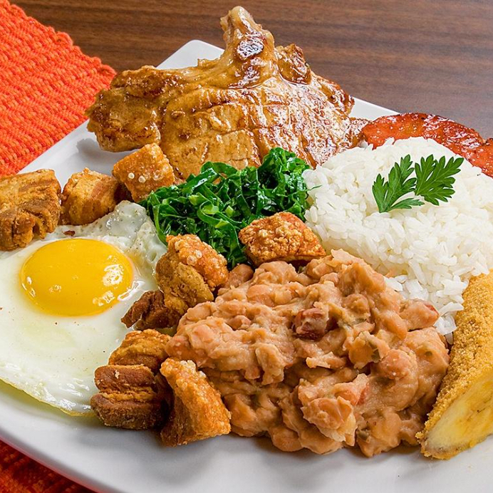 E como explicar o sabor deste prato completo com arroz branco, tutu de feijão, ovo, torresmo, bisteca, linguiça, banana à milanesa e couve na manteiga.