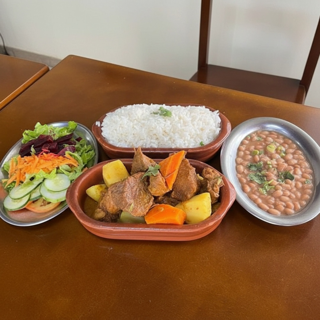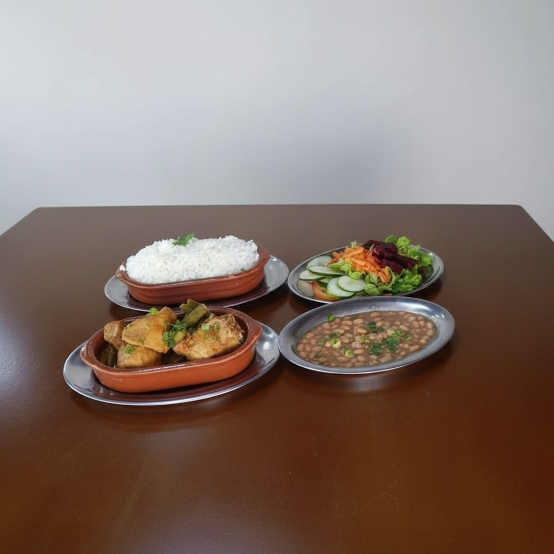 Acompanhamentos: arroz, feijão e salada