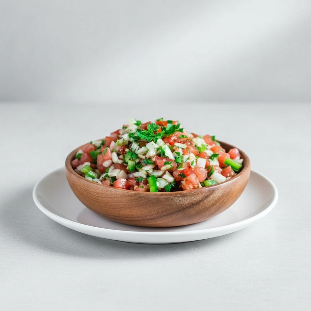 Vinagrete caseiro com tomates e cebolas picadinhos, salsinha, azeite, vinagre e sal.
