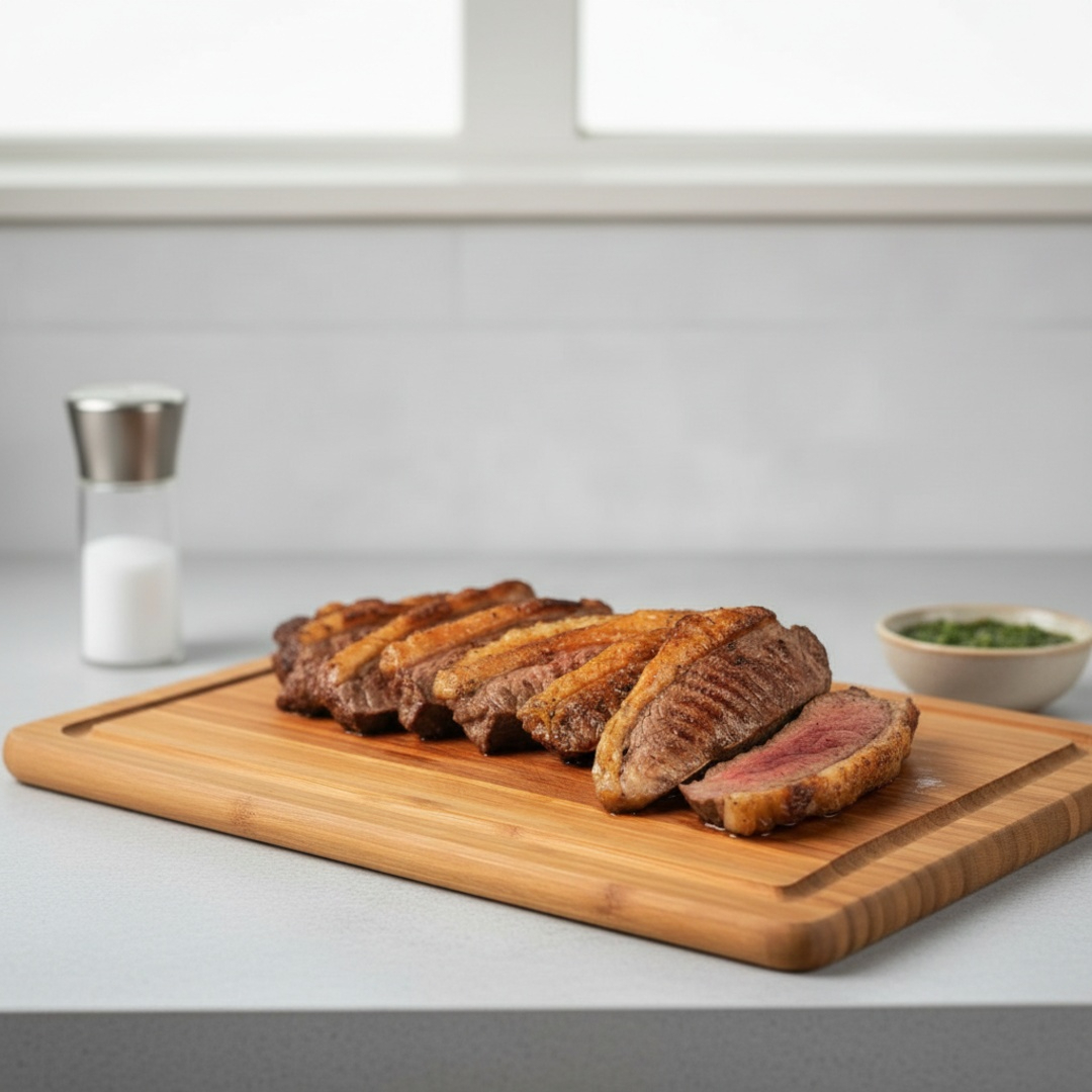 Uma deliciosa porção de picanha grelhada e fatiada.