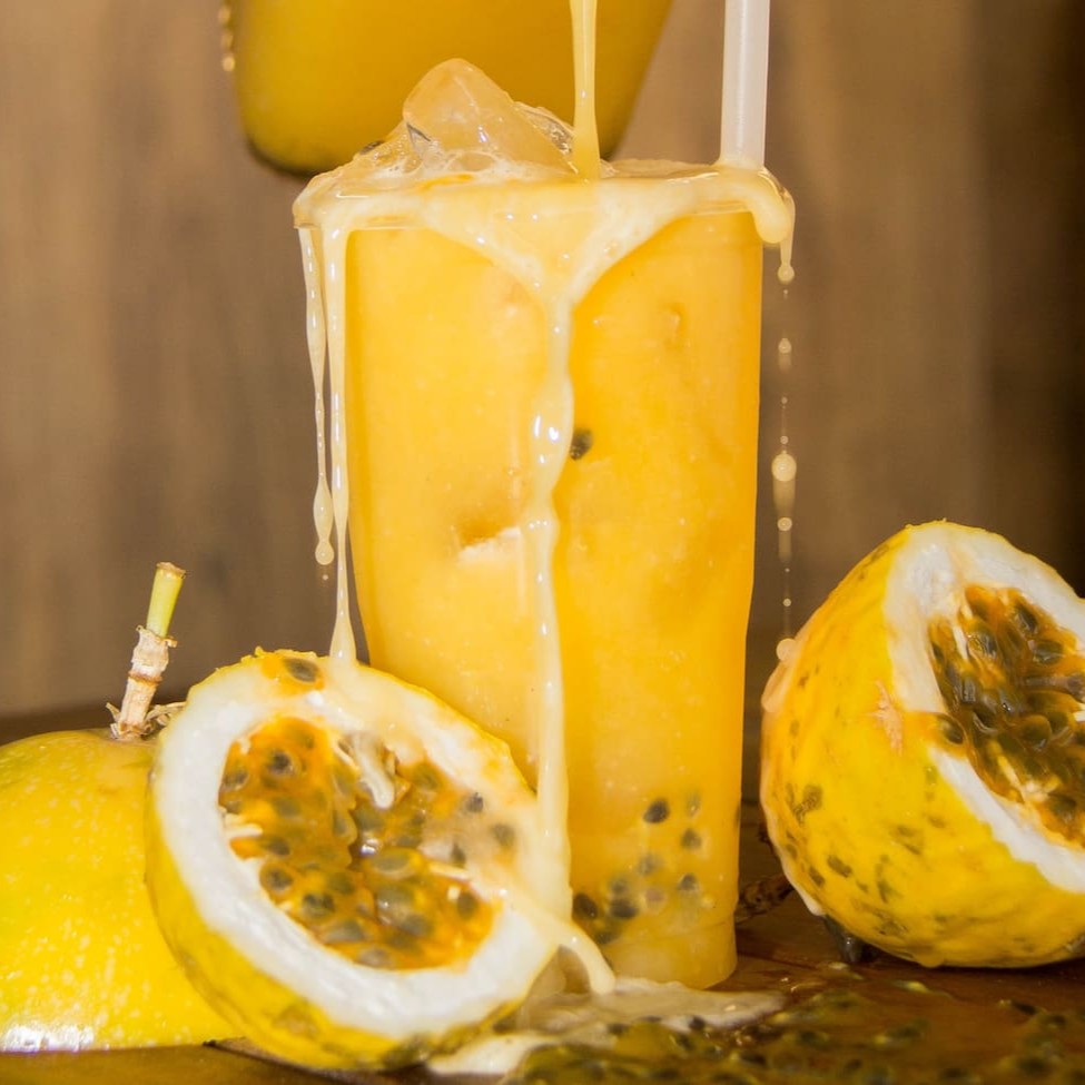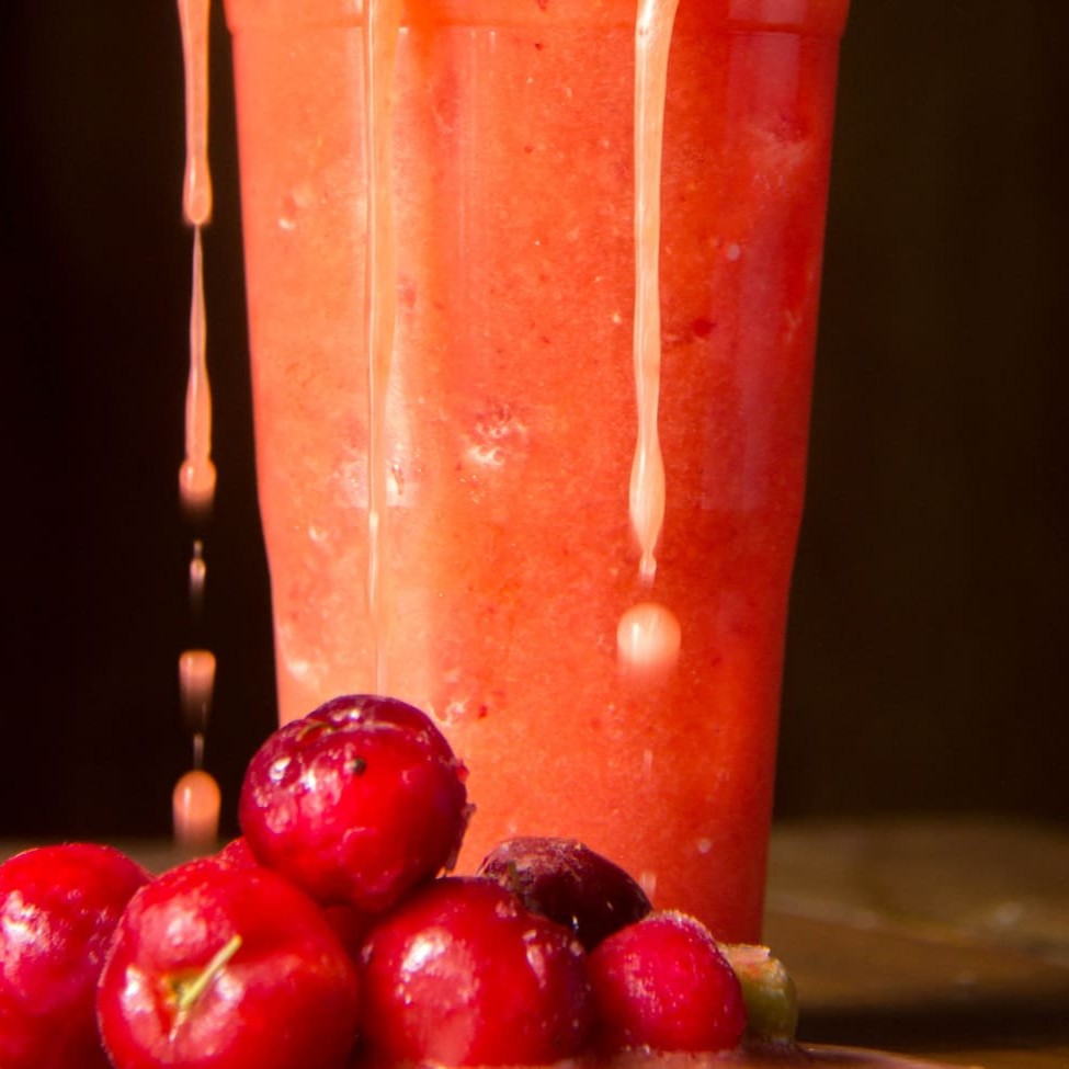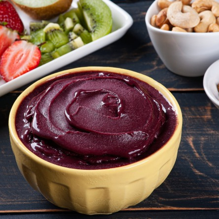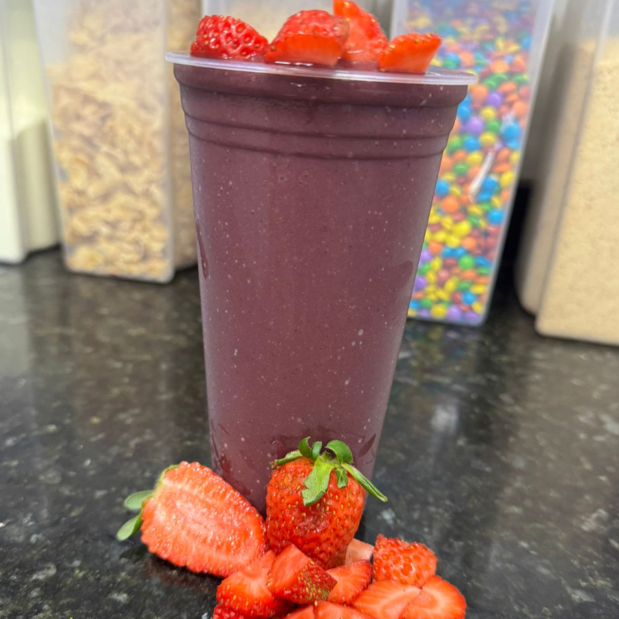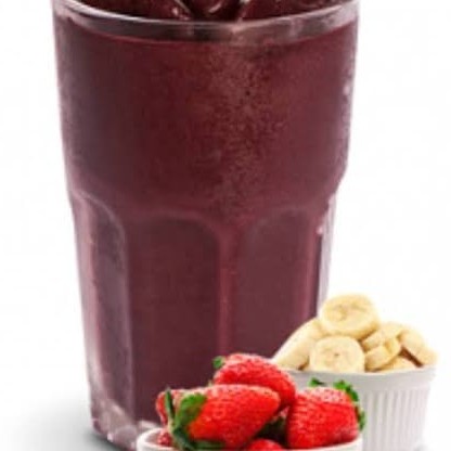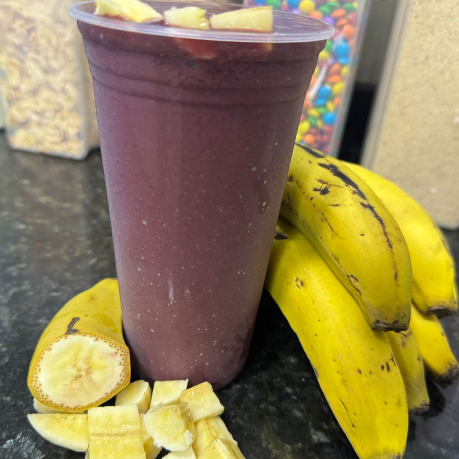 Açai Batido com água e pedaços de fruta a sua escolha dentro na bebida