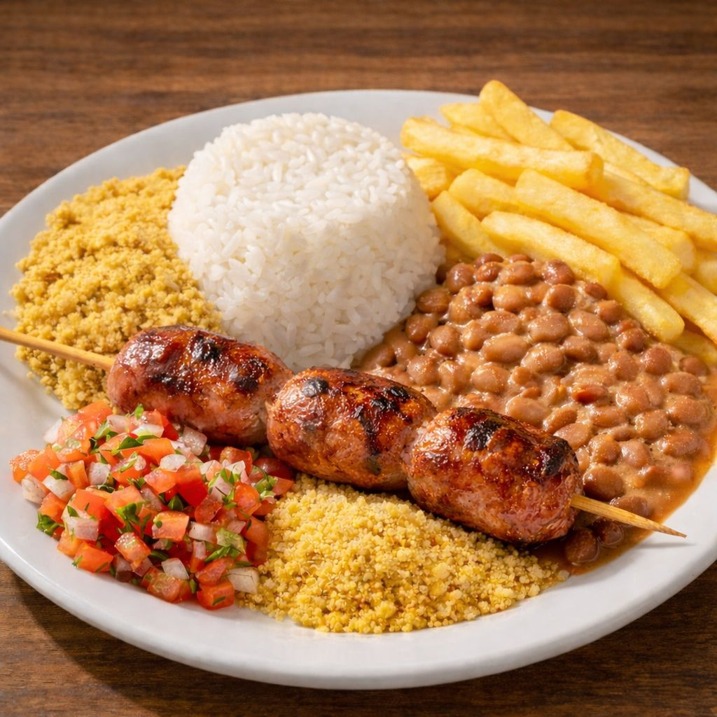 Executivo de Espeto de Linguiça suculento, servido com arroz soltinho, feijão caseiro, farofa crocante, vinagrete fresquinho e batata frita douradinha. Um prato completo, saboroso e feito pra matar a sua fome!
