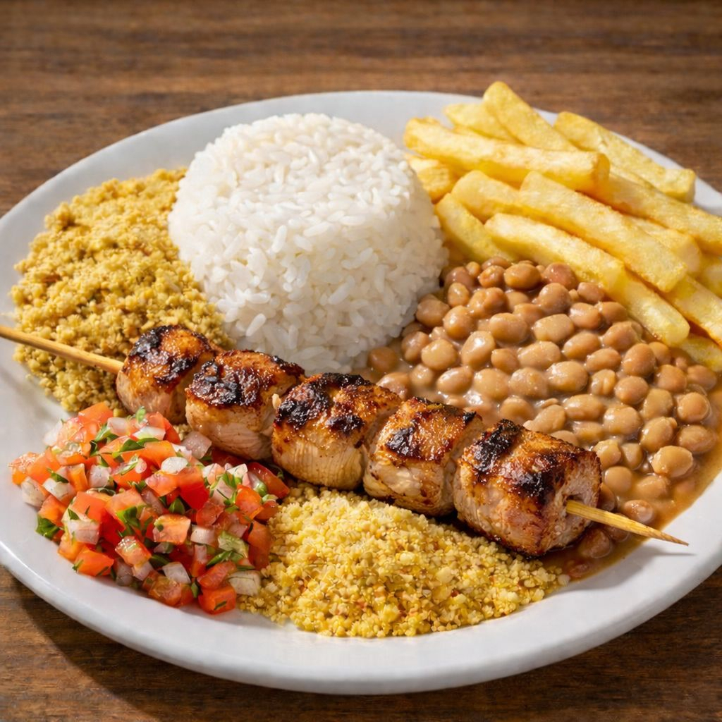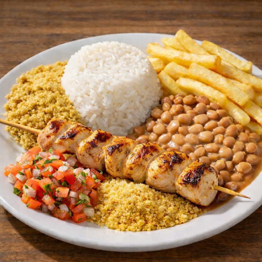 Executivo de Espeto de Frango suculento, servido com arroz soltinho, feijão caseiro, farofa crocante, vinagrete fresquinho e batata frita douradinha. Um prato completo, saboroso e feito pra matar a sua fome!