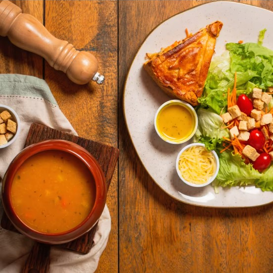 Nele reunimos os melhores produtos da casa com um preço especial para você, confira: 1 Fatia de Torta Salgada à sua escolha + 1 Bowl de Salada + 1 Acompanhamento à sua escolha.