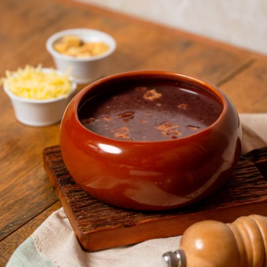 Nosso Fantástico Caldo de Feijão leva pedaços generosos de bacon, e é temperado com alho e sal.