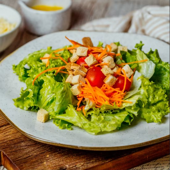 Nossa Fantástica Salada é feita com ingredientes são frescos: alface crespa, rúcula, cenoura ralada, tomate cereja e queijo parmesão fresco ralado. Acompanha croutons e molho mostarda.