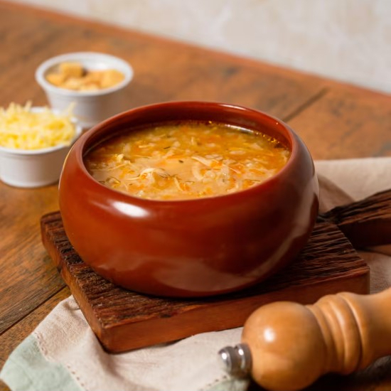 Nossa fantástica Canja leva peito de frango desfiado e bem refogadinho, arroz e cenoura fresca. Temperada com cebola, alho e sal.