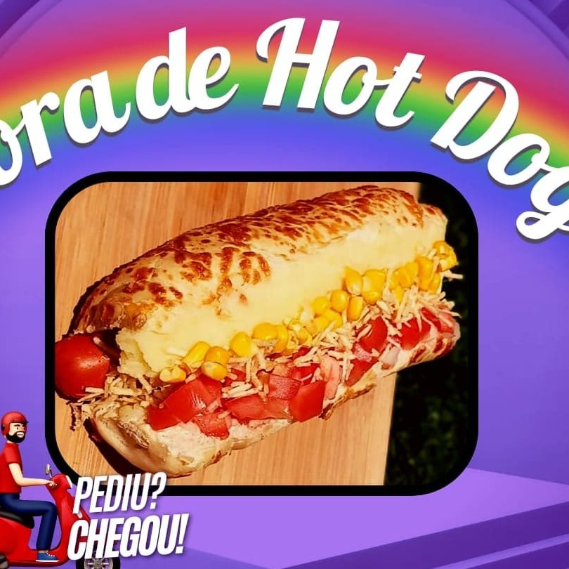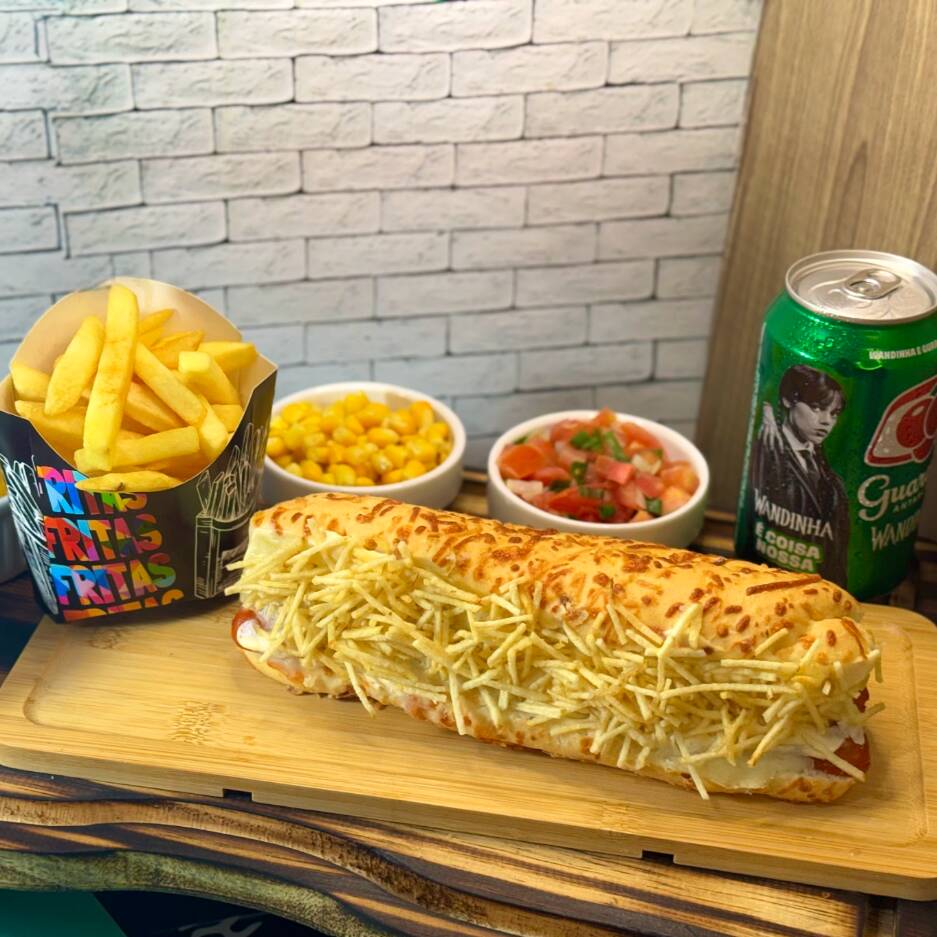 Baguete de queijo parmesão, maionese, salsicha,milho, vinagrete, ketchup,mostarda, purê e batata palha.
