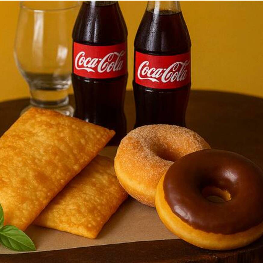 Combo especial Love casal ou para 2 pessoas , acompanha 2 pastéis recheados deliciosos , 2 donuts tradicionais e 2 coca - cola 200ml