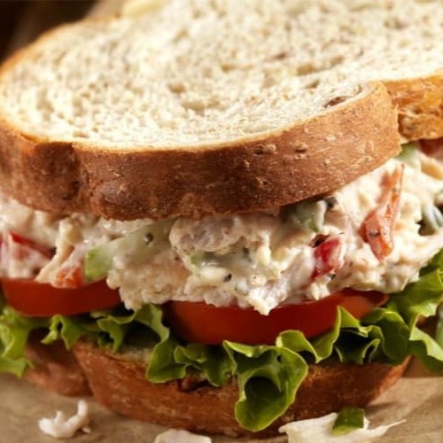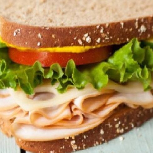 Peito de peru,alface,tomate,cenoura ralada, maionese no pão de forma integral.