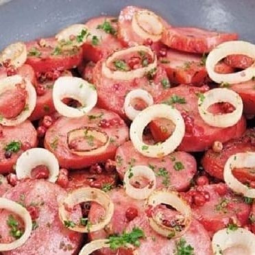 Calabresa Fatiada Grelhada com cebola. 500g acompanha 2 Pães.