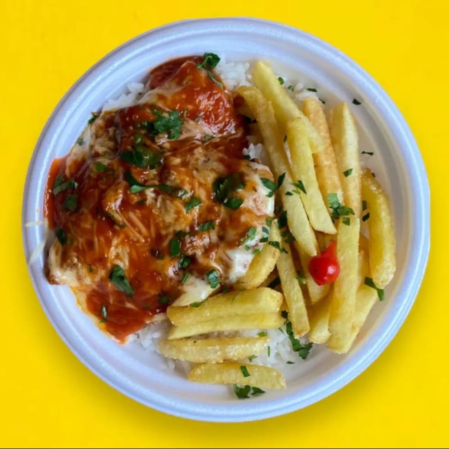 Delicioso filé de frango a parmegiana, acompanha arroz e fritas.