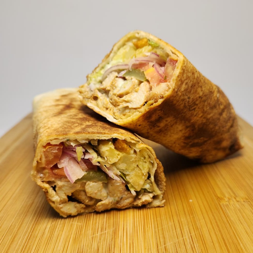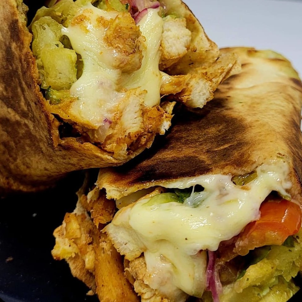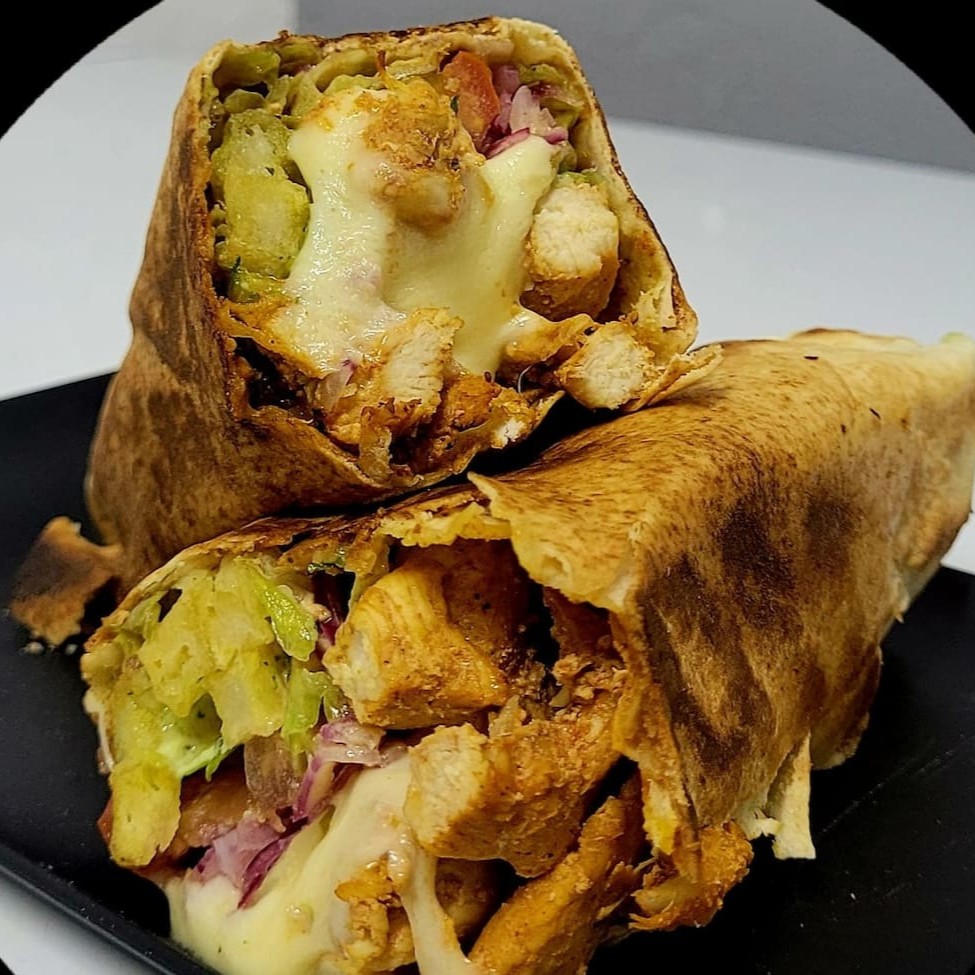 Shawarma de Frango com Queijo: Tiras de frango suculentas, queijo derretido e vegetais frescos à sua escolha!