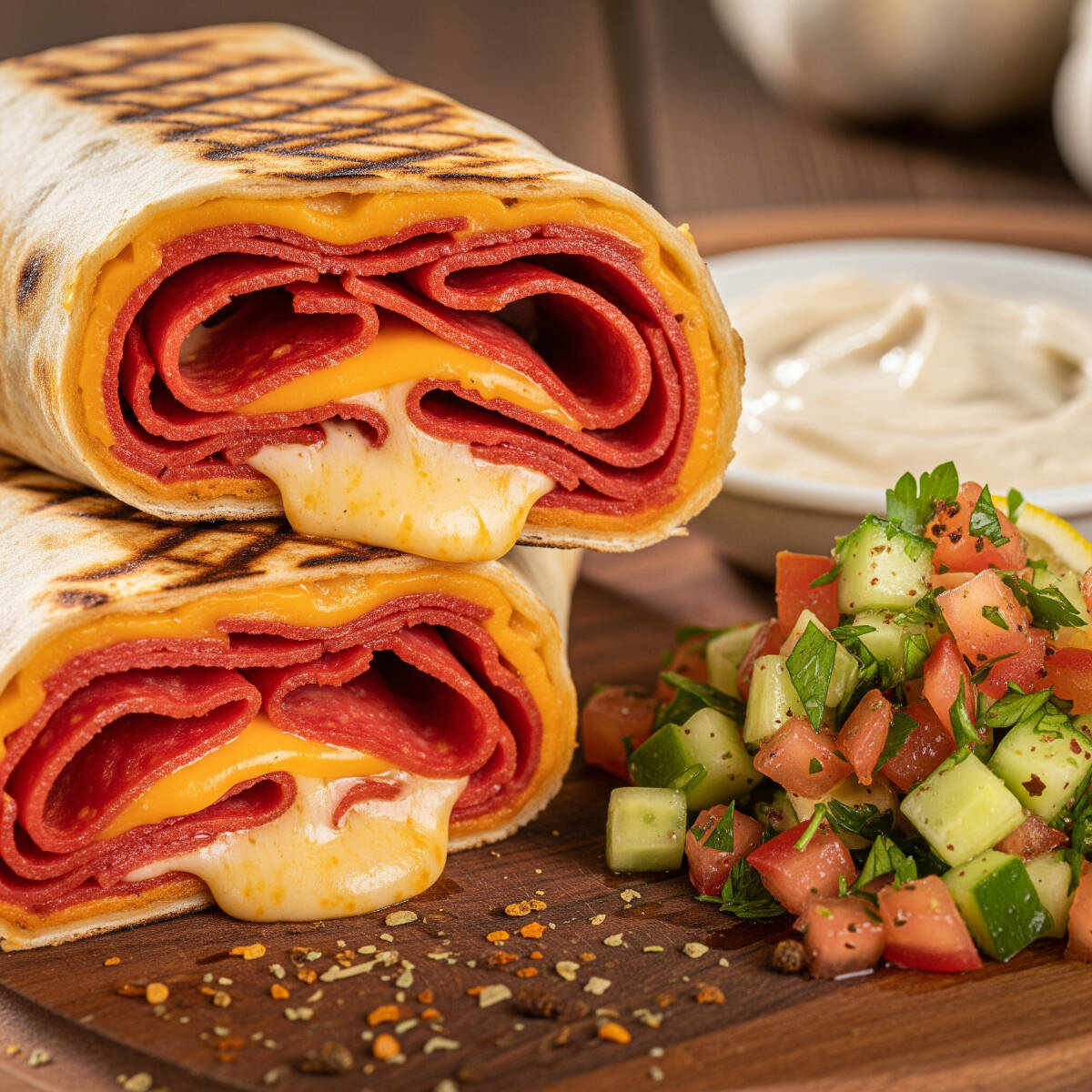 Shawarma de Calabresa com Cheddar: Calabresa fatiada, Cheddar Cremoso e vegetais frescos à sua escolha!